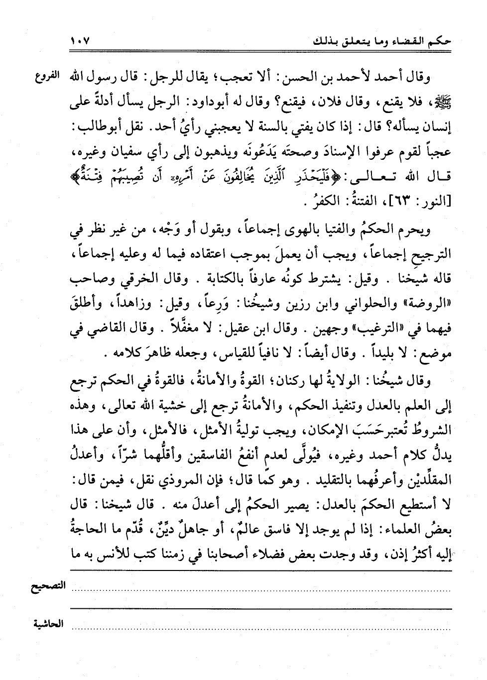 وَيَحْرُمُ الْحُكْمُ وَالْفُتْيَا بِالْهَوَى إجْمَاعًا وَبِقَوْلٍ أَوْ وَجْهٍ عَنْ غَيْرِ نَظَرٍ فِي التَّرْجِيحِ إجْمَاعًا وَيَجِبُ أَنْ يَعْمَلَ بِمُوجِبِ اعْتِقَادِهِ فِيمَا لَهُ وَعَلَيْهِ إجْمَاعًا قَالَهُ شَيْخُنَا وَقِيلَ: يُشْتَرَطُ كَوْنُهُ عَارِفًا بِالْكِتَابَةِ. وَقَالَ الْخِرَقِيُّ وَصَاحِبُ الرَّوْضَةِ وَالْحَلْوَانِيُّ وَابْنُ رَزِينٍ وَشَيْخُنَا: وَرِعًا وَقِيلَ: وَزَاهِدًا وَأَطْلَقَ فِيهِمَا فِي التَّرْغِيبِ وَجْهَيْنِ. وَقَالَ ابْنُ عَقِيلٍ: لَا مُغَفَّلًا وَقَالَ الْقَاضِي فِي مَوْضِعٍ: لَا بَلِيدًا. وَقَالَ أَيْضًا: لَا نَافِيًا لِلْقِيَاسِ وَجَعَلَهُ ظَاهِرَ كَلَامِهِ.