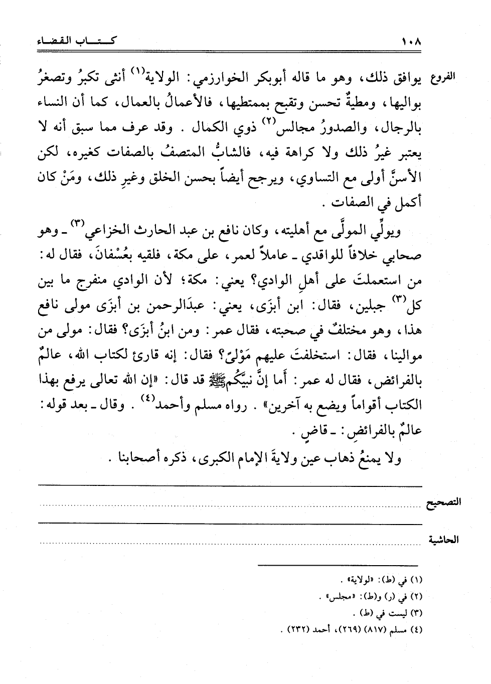وَيُوَلَّى الْمُوَلَّى مَعَ أَهْلِيَّتِهِ وَكَانَ نَافِعُ بْنُ عَبْدِ الحارث الخزاعي3- وَهُوَ صَحَابِيٌّ خِلَافًا لِلْوَاقِدِيِّ عَامِلًا لِعُمَرَ عَلَى مَكَّةَ فَلَقِيَهُ بِعُسْفَانَ فَقَالَ لَهُ: مَنْ اسْتَعْمَلْت عَلَى أَهْلِ الْوَادِي؟ يَعْنِي مَكَّةَ لِأَنَّ الْوَادِيَ مُنْفَرِجٌ مَا بَيْنَ جَبَلَيْنِ فَقَالَ: ابْنُ أَبْزَى يَعْنِي عَبْدَ الرَّحْمَنِ بْنَ أَبْزَى مَوْلَى نَافِعٍ هَذَا وَهُوَ مُخْتَلَفٌ فِي صُحْبَتِهِ فَقَالَ عُمَرُ: وَمَنْ ابْنُ أَبْزَى؟ فَقَالَ: مَوْلًى مِنْ مَوَالِينَا فَقَالَ: اسْتَخْلَفْت عَلَيْهِمْ مَوْلًى؟ فَقَالَ: إنَّهُ قَارِئٌ لِكِتَابِ اللَّهِ عَالَمٌ بِالْفَرَائِضِ فَقَالَ لَهُ عُمَرُ: أَمَا إنَّ نَبِيَّكُمْ صَلَّى اللَّهُ عَلَيْهِ وَسَلَّمَ قَدْ قَالَ: "إنَّ اللَّهَ تَعَالَى يَرْفَعُ بِهَذَا الْكِتَابِ أَقْوَامًا وَيَضَعُ بِهِ آخَرِينَ". رَوَاهُ مُسْلِمٌ وَأَحْمَدُ4 وَقَالَ بَعْدَ قَوْلِهِ: عَالَمٌ بِالْفَرَائِضِ. قَاضٍ.