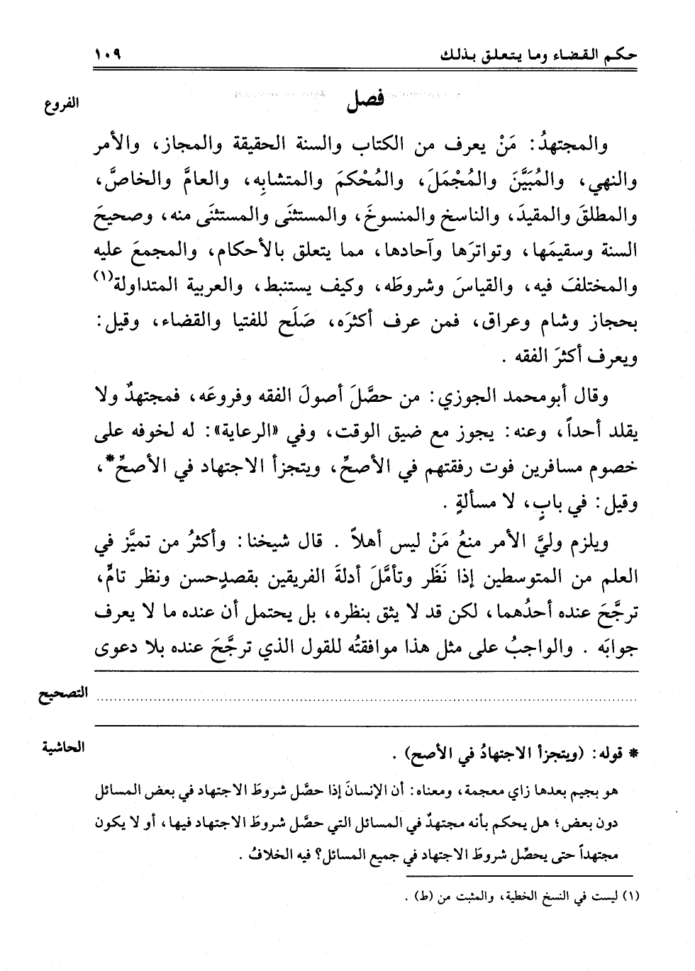 وَالْمُبَيَّنَ وَالْمُجْمَلَ وَالْمُحْكَمَ وَالْمُتَشَابِهَ وَالْعَامَّ وَالْخَاصَّ وَالْمُطْلَقَ وَالْمُقَيَّدَ وَالنَّاسِخَ وَالْمَنْسُوخَ وَالْمُسْتَثْنَى وَالْمُسْتَثْنَى مِنْهُ وَصَحِيحَ السُّنَّةِ وَسَقِيمَهَا وَتَوَاتُرَهَا وَآحَادَهَا مِمَّا يَتَعَلَّقُ بِالْأَحْكَامِ وَالْمُجْمَعَ عَلَيْهِ وَالْمُخْتَلَفَ فِيهِ وَالْقِيَاسَ وَشُرُوطَهُ وَكَيْفَ يَسْتَنْبِطُ وَالْعَرَبِيَّةَ الْمُتَدَاوَلَةَ1 بِحِجَازٍ وَشَامٍ وَعِرَاقٍ. فَمَنْ عَرَفَ أَكْثَرَهُ صَلُحَ لَلْفَتَيَا وَالْقَضَاءِ وَقِيلَ: وَيَعْرِفُ أَكْثَرَ الْفِقْهِ. وَقَالَ أَبُو مُحَمَّدٍ الْجَوْزِيُّ: مَنْ حَصَّلَ أُصُولَ الْفِقْهِ وَفُرُوعَهُ فَمُجْتَهِدٌ وَلَا يُقَلِّدُ أَحَدًا. وَعَنْهُ: يَجُوزُ مَعَ ضِيقِ الْوَقْتِ. وَفِي الرِّعَايَةِ: لَهُ لِخَوْفِهِ عَلَى خُصُومٍ مُسَافِرِينَ فَوْتُ رُفْقَتِهِمْ فِي الْأَصَحِّ وَيَتَجَزَّأُ الِاجْتِهَادُ فِي الْأَصَحِّ وَقِيلَ: فِي بَابٍ لَا مَسْأَلَةٍ.