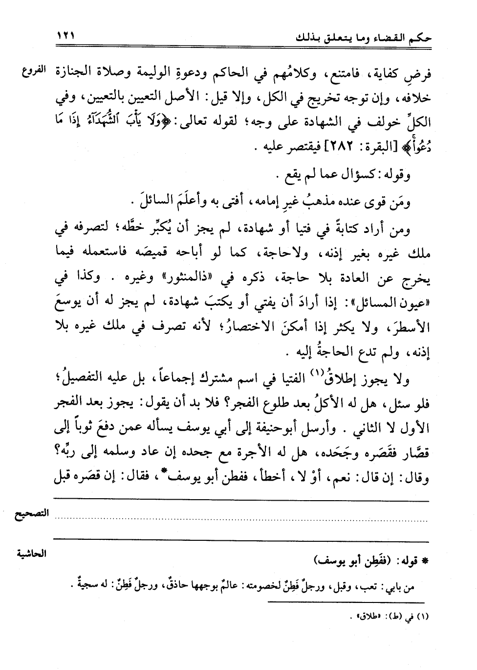 وَلَا يَجُوزُ إطْلَاقُ1 الْفُتْيَا فِي اسْمٍ مُشْتَرَكٍ إجْمَاعًا بَلْ عَلَيْهِ التَّفْصِيلُ فَلَوْ سُئِلَ هَلْ لَهُ الْأَكْلُ بَعْدَ طُلُوعِ الْفَجْرِ فَلَا بُدَّ أَنْ يَقُولَ: يَجُوزُ بَعْدَ الْفَجْرِ الْأَوَّلِ لَا الثَّانِي وَأَرْسَلَ أَبُو حَنِيفَةَ إلَى أَبِي يُوسُفَ سَأَلَهُ عَمَّنْ دَفَعَ ثَوْبًا إلَى قَصَّارٍ فَقَصَرَهُ وَجَحَدَهُ هَلْ لَهُ الْأُجْرَةُ مَعَ جَحْدِهِ إنْ عَادَ وَسَلَّمَهُ إلَى رَبِّهِ وَقَالَ: إنْ قَالَ نَعَمْ أَوْ لَا أَخْطَأَ فَفَطِنَ أَبُو يُوسُفَ فَقَالَ: إنْ قَصَرَهُ قبل