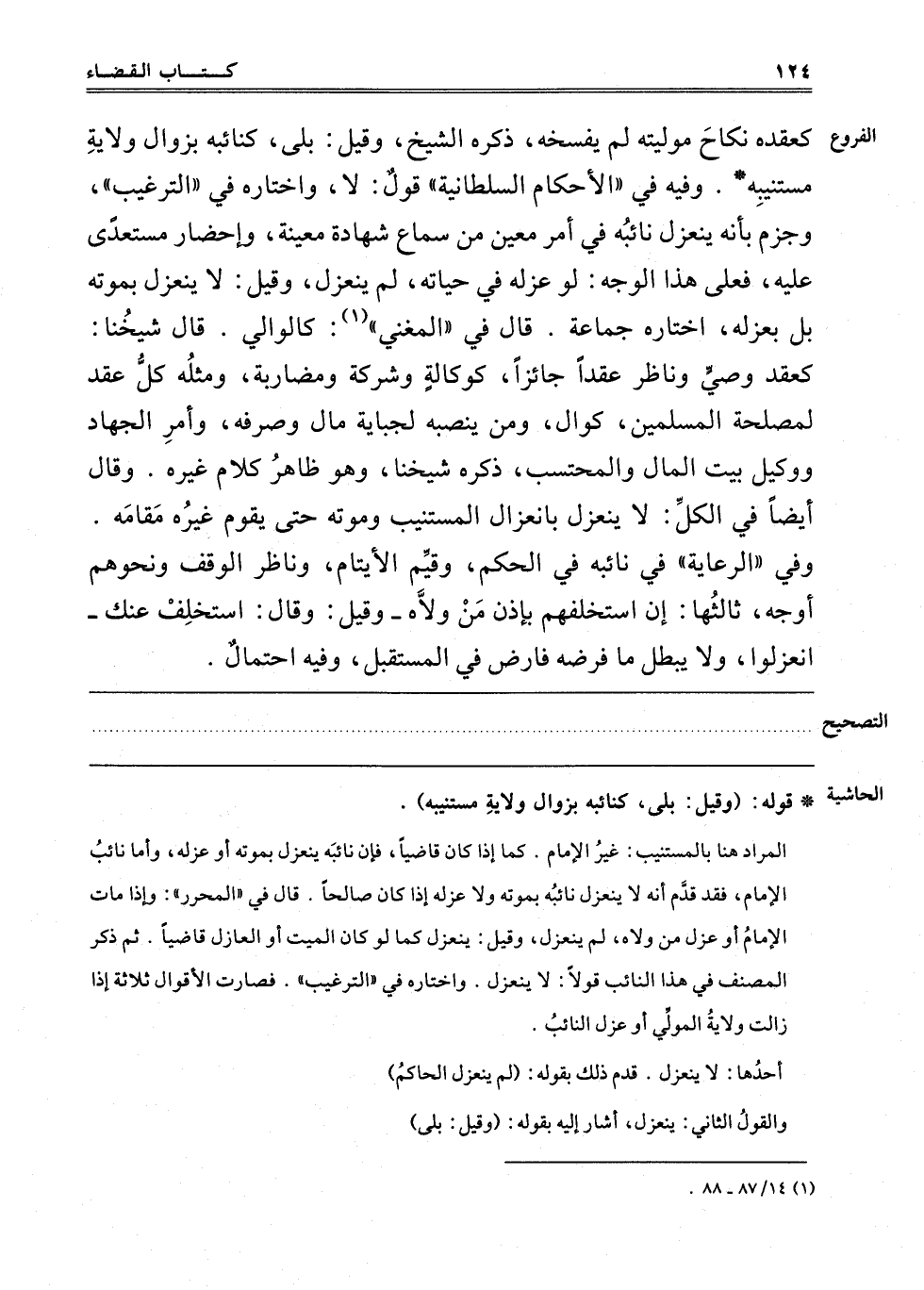 كَعَقْدِهِ نِكَاحَ مُوَلِّيَتِهِ لَمْ يَفْسَخْهُ ذَكَرَهُ الشَّيْخُ وَقِيلَ: بَلَى كَنَائِبِهِ بِزَوَالِ وِلَايَةِ مُسْتَنِيبِهِ وَفِيهِ فِي الْأَحْكَامِ السُّلْطَانِيَّةِ قَوْلٌ: لَا. وَاخْتَارَهُ فِي التَّرْغِيبِ وَجَزَمَ بِأَنَّهُ يَنْعَزِلُ نَائِبُهُ فِي أَمْرٍ مُعَيَّنٍ مِنْ سَمَاعِ شَهَادَةٍ مُعَيَّنَةٍ وَإِحْضَارِ مُسْتَعْدًى عَلَيْهِ فَعَلَى هَذَا الْوَجْهِ لَوْ عَزَلَهُ فِي حَيَاتِهِ لَمْ يَنْعَزِلْ وَقِيلَ: لَا يَنْعَزِلُ بِمَوْتِهِ بَلْ بِعَزْلِهِ اخْتَارَهُ جَمَاعَةٌ قَالَ فِي الْمُغْنِي1: كَالْوَالِي قَالَ شَيْخُنَا: كَعَقْدِ وَصِيٍّ وَنَاظِرٍ عَقْدًا جَائِزًا كَوَكَالَةٍ وَشَرِكَةٍ وَمُضَارَبَةٍ وَمِثْلِهِ كُلُّ عَقْدٍ لِمَصْلَحَةِ الْمُسْلِمِينَ كَوَالٍ وَمَنْ يُنَصِّبُهُ لِجِبَايَةِ مَالٍ وَصَرْفِهِ وَأَمْرِ الْجِهَادِ وَوَكِيلِ بَيْتِ الْمَالِ وَالْمُحْتَسِبِ ذَكَرَهُ شَيْخُنَا وَهُوَ ظَاهِرُ كَلَامِ غَيْرِهِ. وَقَالَ أَيْضًا فِي الْكُلِّ: لَا يَنْعَزِلُ بِانْعِزَالِ الْمُسْتَنِيبِ وَمَوْتِهِ حَتَّى يَقُومَ غَيْرُهُ مَقَامَهُ. وَفِي الرِّعَايَةِ فِي نَائِبِهِ فِي الْحُكْمِ وَقَيِّمِ الْأَيْتَامِ وَنَاظِرِ الْوَقْفِ وَنَحْوِهِمْ أَوْجُهٌ ثَالِثُهَا إنْ اسْتَخْلَفَهُمْ بِإِذْنِ مَنْ وَلَّاهُ وَقِيلَ: وَقَالَ اسْتَخْلِفْ عَنْك انْعَزَلُوا وَلَا يَبْطُلُ مَا فَرَضَهُ فَارِضٌ فِي الْمُسْتَقْبَلِ وفيه احتمال.
