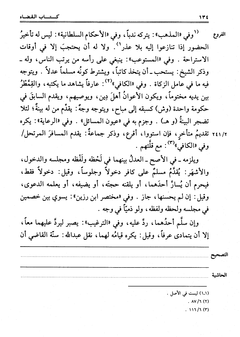 "1وَفِي الْمُذْهَبِ: يَتْرُكُهُ نَدْبًا. وَفِي الْأَحْكَامِ السُّلْطَانِيَّةِ: لَيْسَ لَهُ تَأْخِيرُ الْحُضُورِ إذَا تَنَازَعُوا إلَيْهِ بِلَا عُذْرٍ1" وَلَا لَهُ أَنْ يَحْتَجِبَ إلَّا فِي أَوْقَاتِ الِاسْتِرَاحَةِ. وَفِي الْمُسْتَوْعِبِ: يَنْبَغِي عَلَى رَأْسِهِ مَنْ يُرَتِّبُ النَّاسَ وَلَهُ وَذَكَرَ الشَّيْخُ: يُسْتَحَبُّ أَنْ يَتَّخِذَ كَاتِبًا. وَيُشْتَرَطُ كَوْنُهُ مُسْلِمًا عَدْلًا وَيَتَوَجَّهُ فِيهِ مَا فِي عَامِلِ الزَّكَاةِ. وَفِي الْكَافِي2: عَارِفًا يُشَاهِدُ مَا يَكْتُبُهُ وَالْقِمْطَرُ بَيْنَ يَدَيْهِ مَخْتُومًا وَيَكُونُ الْأَعْوَانُ أَهْلَ دِينٍ وَيُوصِيهِمْ وَيُقَدِّمُ السَّابِقَ فِي حُكُومَةٍ وَاحِدَةٍ وش كَسَبْقِهِ إلَى مُبَاحٍ وَيَتَوَجَّهُ وَجْهٌ: يُقَدِّمُ مَنْ لَهُ بَيِّنَةٌ لِئَلَّا تَضَجَّرَ الْبَيِّنَةُ وهـ وَجَزَمَ بِهِ فِي عُيُونِ الْمَسَائِلِ. وَفِي الرِّعَايَةِ: يُكْرَهُ تَقْدِيمُ مُتَأَخِّرٍ فَإِنْ اسْتَوَوْا أَقْرَعَ وَذَكَرَ جَمَاعَةٌ: يُقَدِّمُ الْمُسَافِرَ الْمُرْتَحِلَ. وَفِي الْكَافِي3: مَعَ قِلَّتِهِمْ.