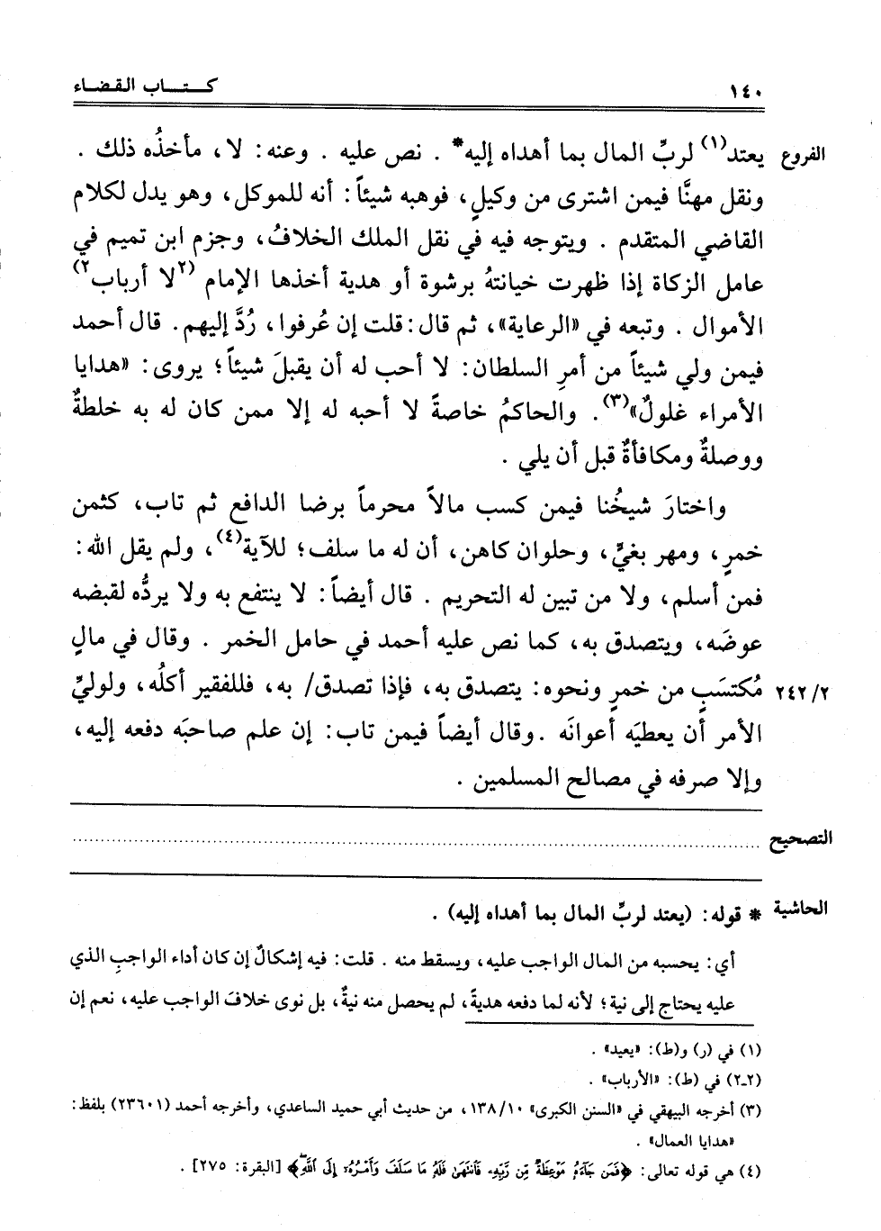 يعتد1 لِرَبِّ الْمَالِ بِمَا أَهْدَاهُ إلَيْهِ نَصَّ عَلَيْهِ وَعَنْهُ: لَا مَأْخَذُهُ ذَلِكَ وَنَقَلَ مُهَنَّا فِيمَنْ اشْتَرَى مِنْ وَكِيلٍ فَوَهَبَهُ شَيْئًا أَنَّهُ لِلْمُوَكِّلِ وَهُوَ يَدُلُّ لِكَلَامِ الْقَاضِي الْمُتَقَدِّمِ وَيَتَوَجَّهُ فِيهِ فِي نَقْلِ الْمِلْكِ الْخِلَافُ وَجَزَمَ ابْنُ تَمِيمٍ فِي عَامِلِ الزَّكَاةِ إذَا ظَهَرَتْ خِيَانَتُهُ بِرِشْوَةٍ أَوْ هَدِيَّةٍ أَخَذَهَا الْإِمَامُ "2لَا أَرْبَابُ2" الْأَمْوَالِ وَتَبِعَهُ فِي الرِّعَايَةِ ثُمَّ قَالَ: قُلْت إنْ عَرَفُوا رُدَّ إلَيْهِمْ قَالَ أَحْمَدُ فِيمَنْ وُلِّيَ شَيْئًا مِنْ أَمْرِ السُّلْطَانِ: لَا أُحِبُّ لَهُ أَنْ يَقْبَلَ شَيْئًا يَرْوِي: هَدَايَا الْأُمَرَاءِ غُلُولٌ3. وَالْحَاكِمُ خَاصَّةً لَا أُحِبُّهُ لَهُ إلَّا مِمَّنْ كَانَ لَهُ بِهِ خُلْطَةٌ وَوَصْلَةٌ وَمُكَافَأَةٌ قَبْلَ أَنْ يَلِيَ. وَاخْتَارَ شَيْخُنَا فِيمَنْ كَسَبَ مَالًا مُحَرَّمًا بِرِضَا الدَّافِعِ ثُمَّ تَابَ كَثَمَنِ خَمْرٍ وَمَهْرِ بِغَيٍّ وَحُلْوَانُ كَاهِنٍ أَنَّ لَهُ مَا سلف للآية4 وَلَمْ يَقُلْ اللَّهُ: فَمَنْ أَسْلَمَ وَلَا مَنْ تَبَيَّنَ لَهُ التَّحْرِيمُ قَالَ أَيْضًا: لَا يَنْتَفِعُ بِهِ وَلَا يَرُدُّهُ لِقَبْضِهِ عِوَضَهُ وَيَتَصَدَّقُ بِهِ كَمَا نَصَّ عَلَيْهِ أَحْمَدُ فِي حَامِلِ الْخَمْرِ وَقَالَ فِي مَالٍ مُكْتَسَبٍ مِنْ خَمْرٍ وَنَحْوِهِ: يَتَصَدَّقُ بِهِ فَإِذَا تَصَدَّقَ بِهِ فَلِلْفَقِيرِ أَكْلُهُ وَلِوَلِيِّ الْأَمْرِ أَنْ يُعْطِيَهُ أَعْوَانَهُ. وَقَالَ أَيْضًا: فِيمَنْ تَابَ إنْ عَلِمَ صَاحِبُهُ دَفَعَهُ إلَيْهِ وإلا صرفه في مصالح المسلمين.