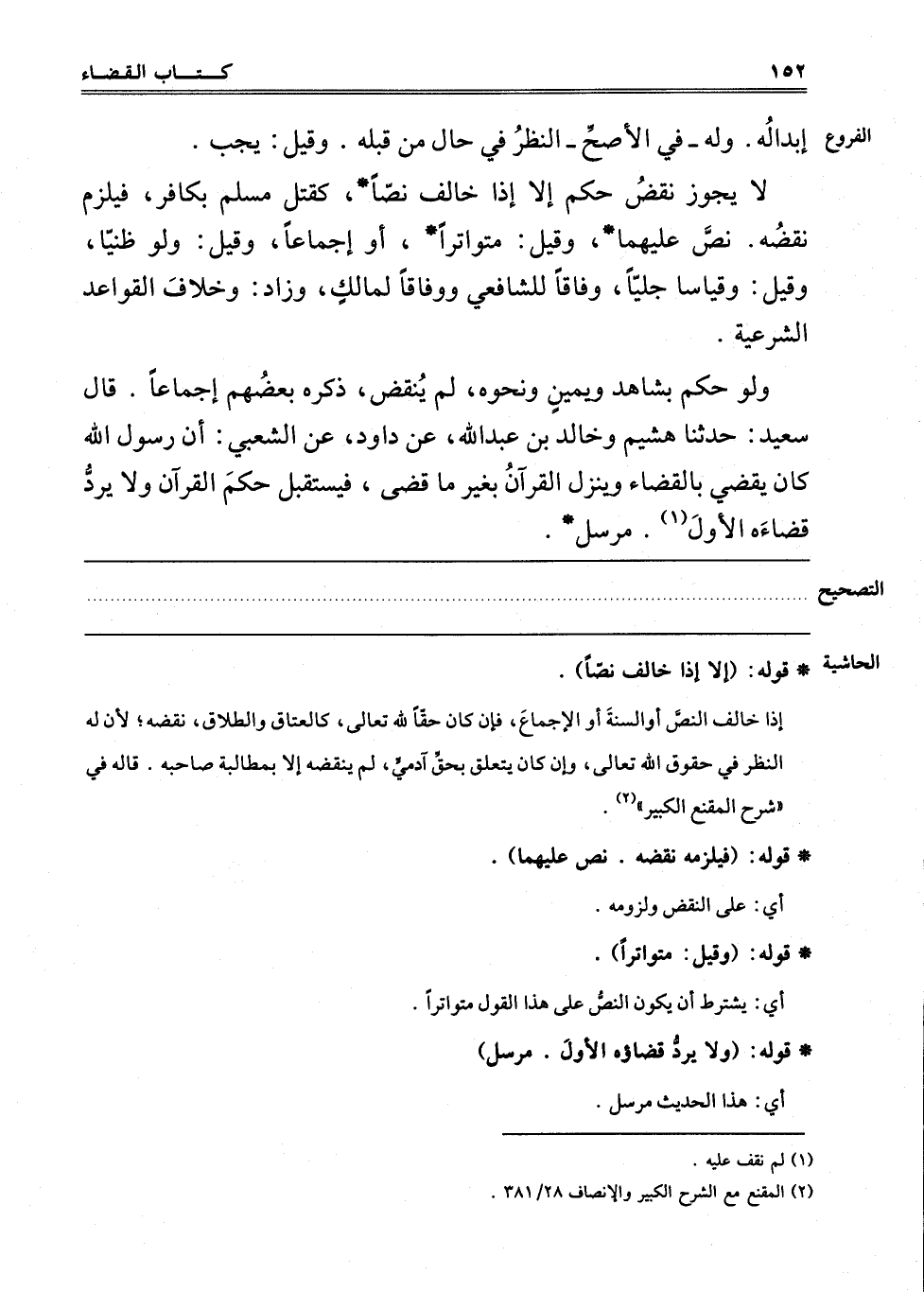 لا يَجُوزُ نَقْضُ حُكْمٍ إلَّا إذَا خَالَفَ نَصًّا كَقَتْلِ مُسْلِمٍ بِكَافِرٍ فَيَلْزَمُ نَقْضُهُ نَصَّ عَلَيْهِمَا وَقِيلَ: مُتَوَاتِرًا أَوْ إجْمَاعًا وَقِيلَ: وَلَوْ ظَنِّيًّا. وَقِيلَ: وَقِيَاسًا جَلِيًّا وِفَاقًا لِلشَّافِعِيِّ وَوِفَاقًا لِمَالِكٍ وَزَادَ: وَخِلَافُ الْقَوَاعِدِ الشَّرْعِيَّةِ. وَلَوْ حَكَمَ بِشَاهِدٍ وَيَمِينٍ وَنَحْوِهِ لَمْ يُنْقَضْ ذَكَرَهُ بَعْضُهُمْ إجْمَاعًا: قَالَ سَعِيدٌ: حَدَّثَنَا هُشَيْمٌ وَخَالِدُ بْنُ عَبْدِ اللَّهِ عَنْ دَاوُد عَنْ الشَّعْبِيِّ أَنَّ رَسُولَ اللَّهِ صَلَّى اللَّهُ عَلَيْهِ وَسَلَّمَ كَانَ يَقْضِي بِالْقَضَاءِ وَيَنْزِلُ الْقُرْآنُ بِغَيْرِ مَا قَضَى فَيَسْتَقْبِلُ حُكْمَ الْقُرْآنِ وَلَا يَرُدُّ قَضَاءَهُ الْأَوَّلَ1. مُرْسَلٌ.