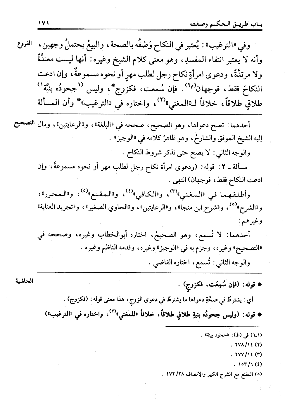 وَدَعْوَى امْرَأَةٍ نِكَاحَ رَجُلٍ لِطَلَبِ مَهْرٍ أَوْ نَحْوِهِ مَسْمُوعَةٌ وَإِنْ ادَّعَتْ النِّكَاحَ فَقَطْ فَوَجْهَانِ م 2 فَإِنْ سَمِعَتْ فكزوج وليس "1جحوده بَيِّنَةِ1" طَلَاقٍ طَلَاقًا خِلَافًا لِلْمُغْنِي2 وَاخْتَارَهُ فِي الترغيب وأن المسألة