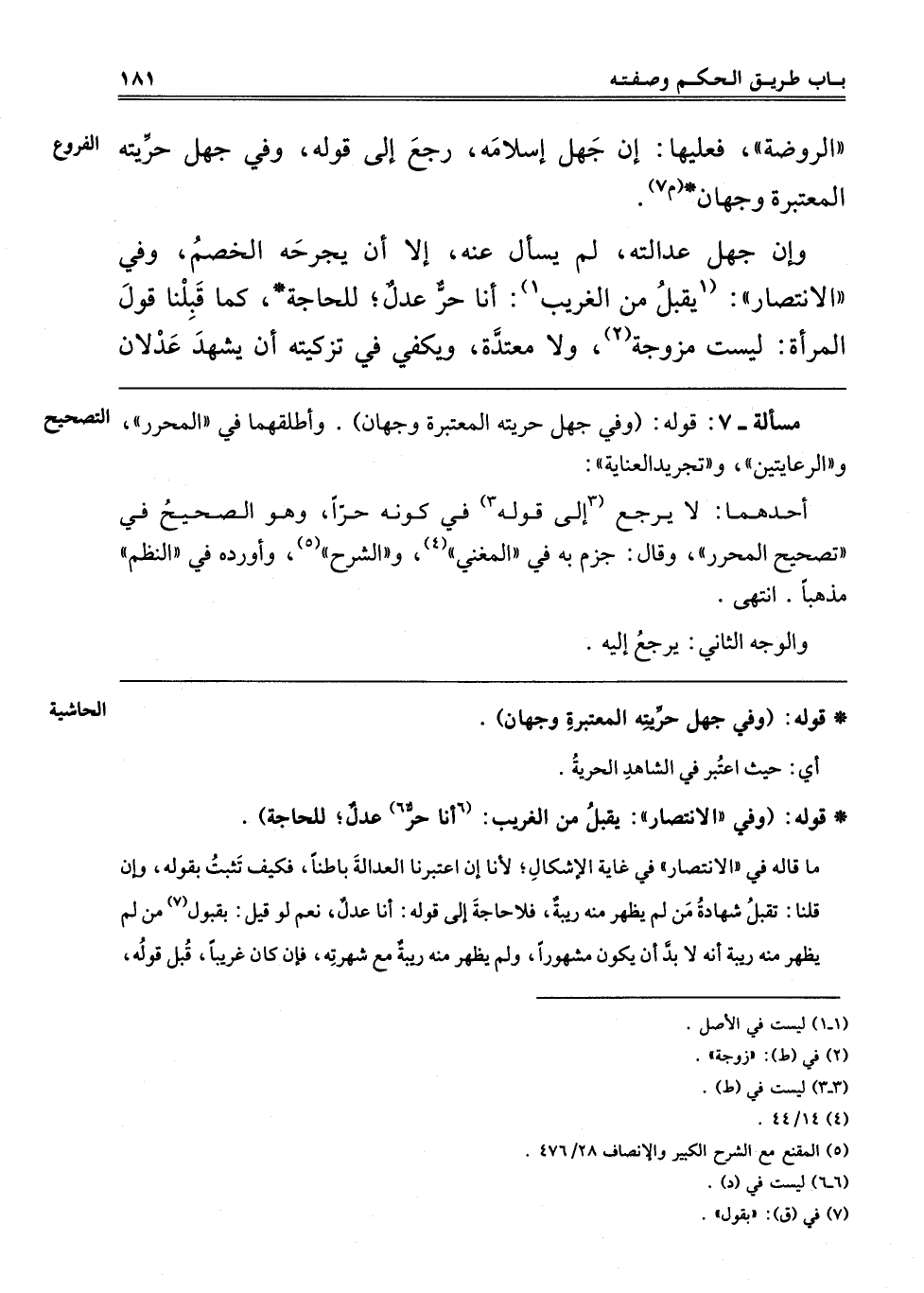 ـــــــــــــــــــــــــــــQمَسْأَلَةٌ 7: قَوْلُهُ: وَفِي جَهْلِ حُرِّيَّتِهِ الْمُعْتَبَرَةِ وَجْهَانِ. وَأَطْلَقَهُمَا فِي الْمُحَرَّرِ وَالرِّعَايَتَيْنِ وَتَجْرِيدِ الْعِنَايَةِ: