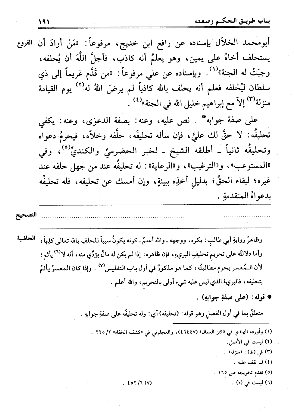 أَبُو مُحَمَّدٍ الْخَلَّالُ بِإِسْنَادِهِ عَنْ رَافِعِ بْنِ خَدِيجٍ مَرْفُوعًا "مَنْ أَرَادَ أَنْ يَسْتَحْلِفَ أَخَاهُ عَلَى يَمِينٍ وَهُوَ يَعْلَمُ أَنَّهُ كَاذِبٌ فَأَجَلَّ اللَّهَ أَنْ يُحَلِّفَهُ وَجَبَتْ لَهُ الْجَنَّةُ" 1. وَبِإِسْنَادِهِ عَنْ عَلِيٍّ مَرْفُوعًا "مَنْ قَدَّمَ غَرِيمًا إلَى ذِي سُلْطَانٍ لِيُحَلِّفَهُ فَعَلِمَ أَنَّهُ يَحْلِفُ بِاَللَّهِ كاذبا لم يرض الله له2 تَعَالَى يَوْمَ الْقِيَامَةِ مَنْزِلَهُ3 إلَّا مَعَ إبْرَاهِيمَ خَلِيلِ اللَّهِ فِي الْجَنَّةِ" 4. عَلَى صِفَةِ جَوَابِهِ نَصَّ عَلَيْهِ وَعَنْهُ: بِصِفَةِ الدَّعْوَى وَعَنْهُ: يَكْفِي تَحْلِيفُهُ: لَا حَقَّ لَك عَلَيَّ فَإِنْ سَأَلَهُ تَحْلِيفَهُ حَلَّفَهُ وَخَلَّاهُ فَيَحْرُمُ دَعْوَاهُ وَتَحْلِيفُهُ ثَانِيًا أَطْلَقَهُ الشَّيْخُ لِحَدِيثِ الْحَضْرَمِيِّ وَالْكِنْدِيِّ5. وَفِي الْمُسْتَوْعِبِ وَالتَّرْغِيبِ وَالرِّعَايَةِ: لَهُ تَحْلِيفُهُ عِنْدَ مَنْ جَهِلَ حَلِفَهُ عِنْدَ غَيْرِهِ لِبَقَاءِ الْحَقِّ بِدَلِيلِ أَخْذِهِ بِبَيِّنَةٍ وَإِنْ أَمْسَكَ عَنْ تَحْلِيفِهِ فَلَهُ تَحْلِيفُهُ بدعواه المتقدمة.