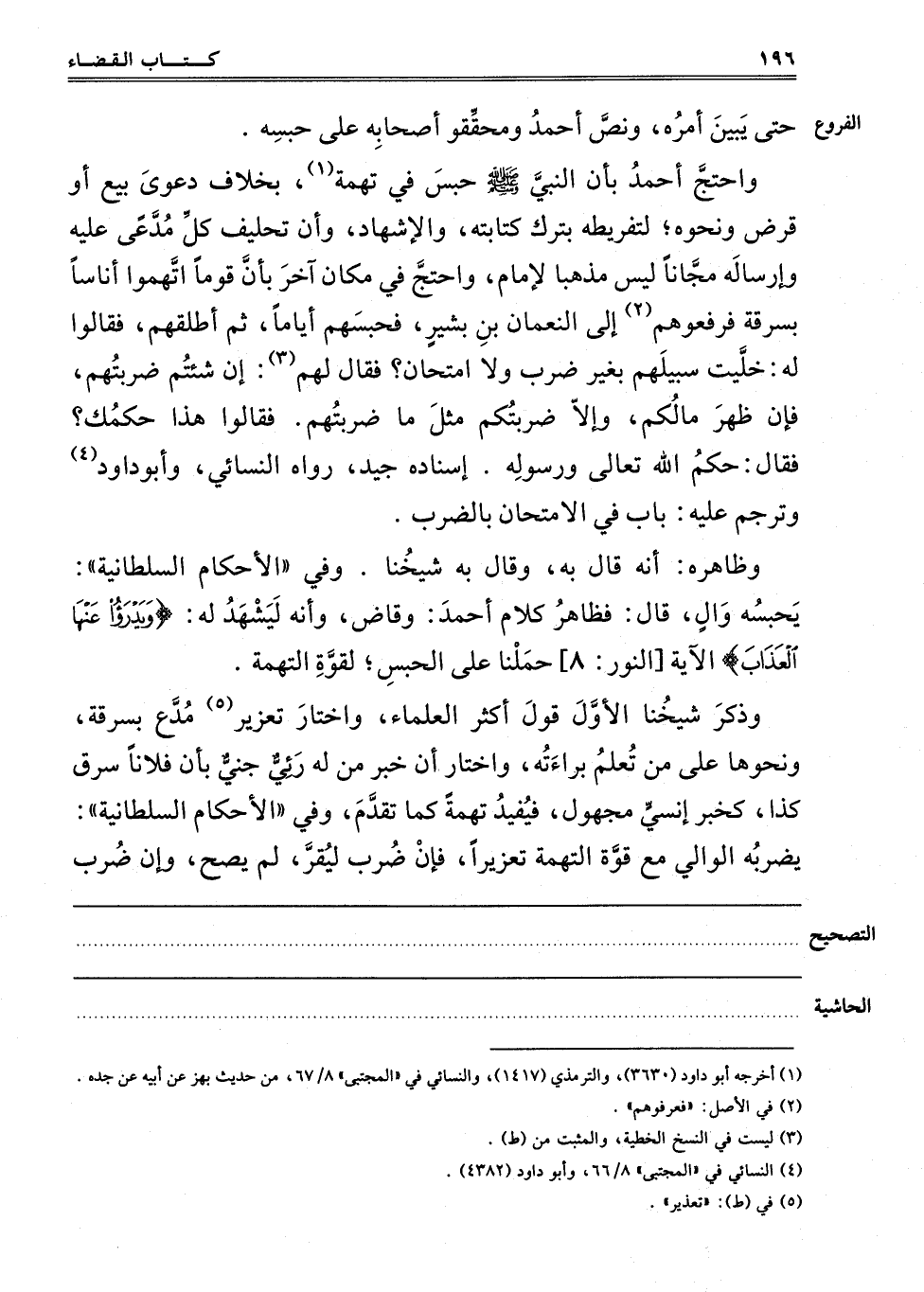 وَاحْتَجَّ أَحْمَدُ بِأَنَّ النَّبِيَّ صَلَّى اللَّهُ عَلَيْهِ وَسَلَّمَ حَبَسَ فِي تُهْمَةٍ1. بِخِلَافِ دَعْوَى بَيْعٍ أَوْ قَرْضٍ وَنَحْوِهِ لِتَفْرِيطِهِ بِتَرْكِ كِتَابَتِهِ وَالْإِشْهَادِ وَأَنَّ تَحْلِيفَ كُلِّ مُدَّعًى عَلَيْهِ وَإِرْسَالَهُ مَجَّانًا لَيْسَ مَذْهَبًا لِإِمَامٍ وَاحْتَجَّ فِي مَكَان آخَرَ بِأَنَّ قَوْمًا اتَّهَمُوا أُنَاسًا بِسَرِقَةٍ فَرَفَعُوهُمْ2 إلَى النُّعْمَانِ بْنِ بَشِيرٍ فَحَبَسَهُمْ أَيَّامًا ثُمَّ أَطْلَقَهُمْ فَقَالُوا لَهُ: خَلَّيْت سَبِيلَهُمْ بِغَيْرِ ضَرْبٍ وَلَا امْتِحَانٍ فَقَالَ لَهُمْ3: إنْ شِئْتُمْ ضَرَبْتهمْ فَإِنْ ظَهَرَ مَا لَكُمْ وَإِلَّا ضَرَبْتُكُمْ مِثْلَ مَا ضَرَبْتهمْ فَقَالُوا هَذَا حُكْمُك؟ فَقَالَ: حُكْمُ اللَّهِ تَعَالَى وَرَسُولِهِ. إسْنَادُهُ جَيِّدٌ رَوَاهُ النَّسَائِيُّ وَأَبُو دَاوُد4 وَتُرْجِمَ عَلَيْهِ: بَابٌ فِي الِامْتِحَانِ بِالضَّرْبِ.