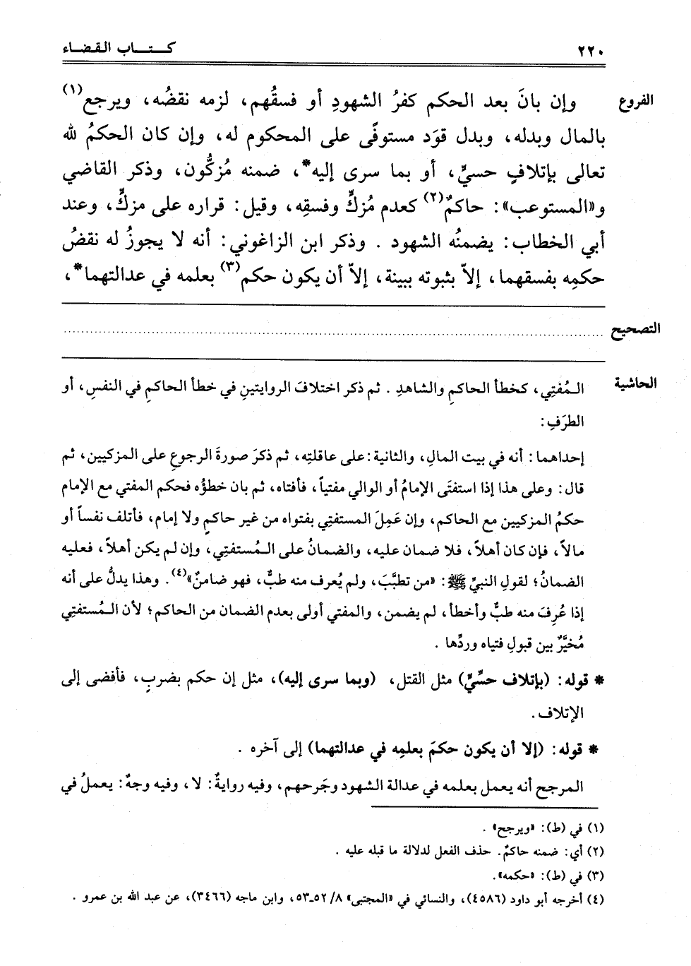 وَإِنْ بَانَ بَعْدَ الْحُكْمِ كُفْرُ الشُّهُودِ أَوْ فِسْقُهُمْ لَزِمَهُ نَقْضُهُ وَيَرْجِعُ1 بِالْمَالِ وَبَدَلِهِ وَبَدَلِ قَوَدٍ مُسْتَوْفًى عَلَى الْمَحْكُومِ لَهُ وَإِنْ كَانَ الحكم لله تعالى بإتلاف حسي أَوْ بِمَا سَرَى إلَيْهِ ضَمِنَهُ مُزَكُّونَ وَذَكَرَ الْقَاضِي وَالْمُسْتَوْعِبُ: حَاكِمٌ2 كَعَدَمِ مُزَكٍّ وَفَسَّقَهُ وَقِيلَ: قَرَارُهُ عَلَى مُزَكٍّ وَعِنْدَ أَبِي الْخَطَّابِ: يَضْمَنُهُ الشُّهُودُ. وَذَكَرَ ابْنُ الزَّاغُونِيِّ أَنَّهُ لَا يَجُوزُ لَهُ نَقْضُ حُكْمِهِ بِفِسْقِهِمَا إلَّا بِثُبُوتِهِ بِبَيِّنَةٍ إلَّا أَنْ يَكُونَ حُكْمٌ3 بِعِلْمِهِ فِي عَدَالَتِهِمَا