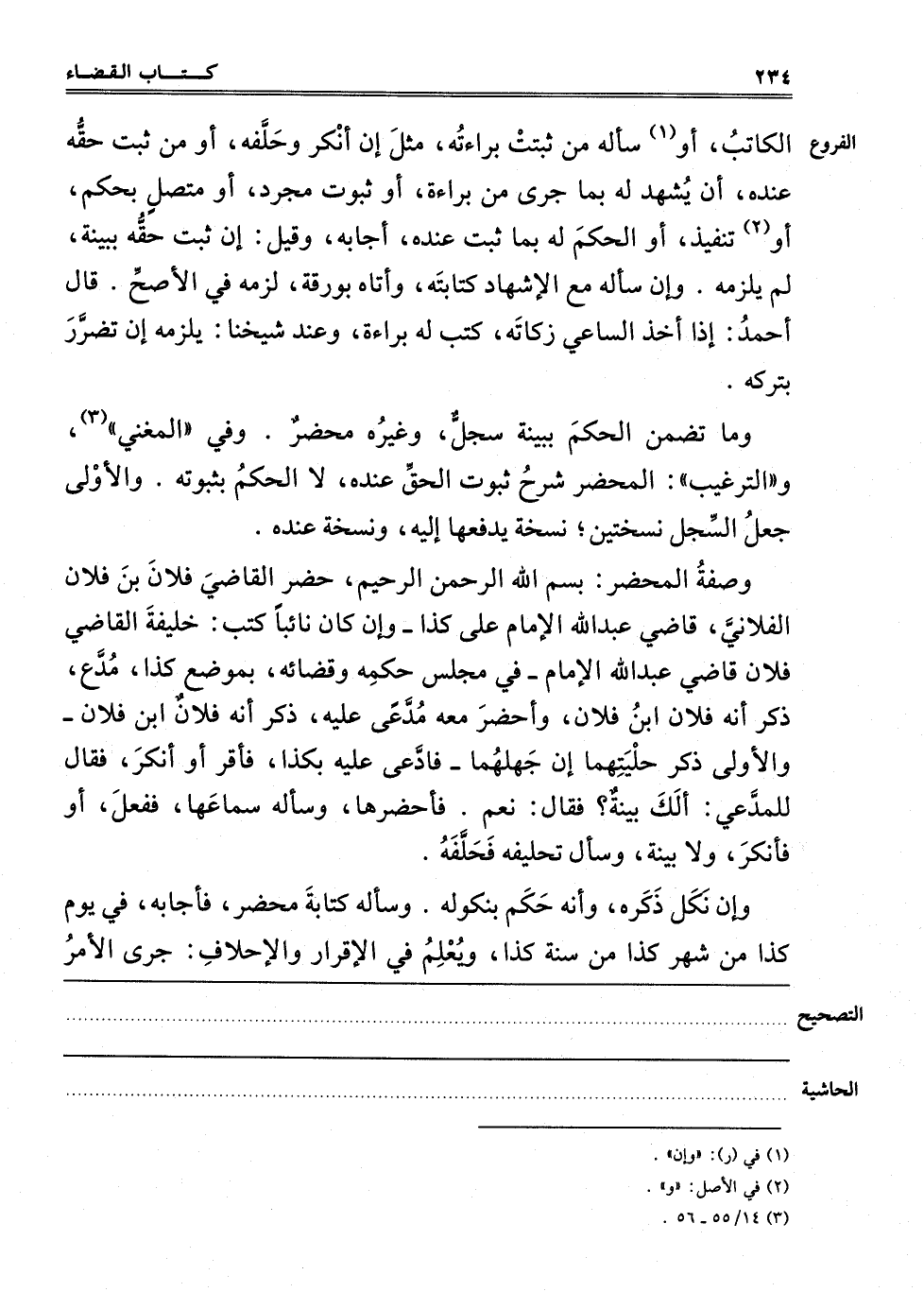 وَصِفَةُ الْمَحْضَرِ: بِسْمِ اللَّهِ الرَّحْمَنِ الرَّحِيمِ حَضَرَ الْقَاضِي فُلَانُ بْنُ فُلَانٍ الْفُلَانِيُّ قَاضِي عَبْدِ اللَّهِ الْإِمَامِ عَلَى كَذَا وَإِنْ كَانَ نَائِبًا كَتَبَ: خَلِيفَةُ الْقَاضِي فُلَانٍ قَاضِي عَبْدِ اللَّه الْإِمَامِ فِي مَجْلِسِ حُكْمِهِ وَقَضَائِهِ بِمَوْضِعِ كَذَا مُدَّعٍ ذَكَرَ أَنَّهُ فُلَانُ بْنُ فُلَانٍ وَأَحْضَرَ مَعَهُ مُدَّعًى عَلَيْهِ ذَكَرَ أَنَّهُ فُلَانُ بْنُ فُلَانٍ وَالْأَوْلَى ذِكْرُ حِلْيَتِهِمَا إنْ جَهِلَهُمَا فَادَّعَى عَلَيْهِ بِكَذَا فَأَقَرَّ أَوْ أَنْكَرَ فَقَالَ لِلْمُدَّعِي: أَلَك بَيِّنَةٌ قَالَ نَعَمْ فَأَحْضَرَهَا وَسَأَلَهُ سَمَاعَهَا فَفَعَلَ أَوْ فَأَنْكَرَ وَلَا بَيِّنَةَ وَسَأَلَ تَحْلِيفَهُ فَحَلَّفَهُ.