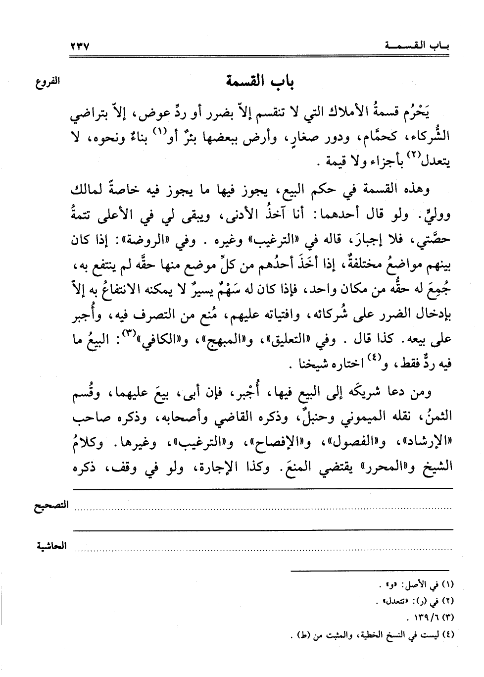 وَهَذِهِ الْقِسْمَةُ فِي حُكْمِ الْبَيْعِ يَجُوزُ فِيهَا مَا يَجُوزُ فِيهِ خَاصَّةً لِمَالِكٍ وَوَلِيٍّ وَلَوْ قَالَ أَحَدُهُمَا: أَنَا آخُذُ الْأَدْنَى وَيَبْقَى لِي فِي الْأَعْلَى تَتِمَّةُ حِصَّتِي فَلَا إجْبَارَ قَالَهُ فِي التَّرْغِيبِ وَغَيْرِهِ. وَفِي الرَّوْضَةِ: إذَا كَانَ بَيْنَهُمْ مَوَاضِعُ مُخْتَلِفَةٌ إذَا أَخَذَ أَحَدُهُمْ مِنْ كُلِّ مَوْضِعٍ مِنْهَا حَقَّهُ لَمْ يَنْتَفِعْ بِهِ جُمِعَ لَهُ حَقُّهُ مِنْ مَكَان وَاحِدٍ فَإِذَا كَانَ لَهُ سَهْمٌ يَسِيرٌ لَا يُمْكِنُهُ الِانْتِفَاعُ بِهِ إلَّا بِإِدْخَالِ الضَّرَرِ عَلَى شُرَكَائِهِ وَافْتِيَاتِهِ عَلَيْهِمْ مُنِعَ مِنْ التَّصَرُّفِ فِيهِ وَأُجْبِرَ عَلَى بَيْعِهِ كَذَا قَالَ وَفِي التَّعْلِيقِ وَالْمُبْهِجِ وَالْكَافِي3: الْبَيْعُ مَا فِيهِ رَدٌّ فَقَطْ و4اختاره شيخنا.