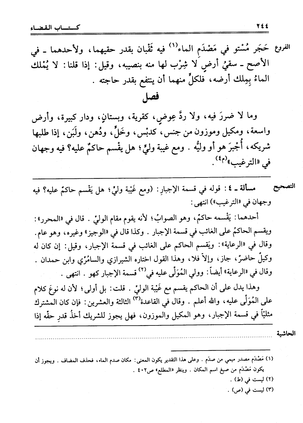 ـــــــــــــــــــــــــــــQمَسْأَلَةٌ 4: قَوْلُهُ: فِي قِسْمَةِ الْإِجْبَارِ وَمَعَ غَيْبَةِ وَلِيٍّ هَلْ يُقَسِّمُ حَاكِمٌ عَلَيْهِ؟ فِيهِ وَجْهَانِ فِي التَّرْغِيبِ انْتَهَى: أَحَدُهُمَا: يُقَسِّمُهُ حَاكِمٌ وَهُوَ الصَّوَابُ لِأَنَّهُ يَقُومُ مَقَامَ الْوَلِيِّ قَالَ فِي الْمُحَرَّرِ: وَيُقَسِّمُ الْحَاكِمُ عَلَى الْغَائِبِ فِي قِسْمَةِ الْإِجْبَارِ وَكَذَا قَالَ فِي الْوَجِيزِ وَغَيْرِهِ وَهُوَ عَامٌّ وَقَالَ فِي الرِّعَايَةِ: وَيُقَسِّمُ الْحَاكِمُ عَلَى الْغَائِبِ فِي قِسْمَةِ الْإِجْبَارِ وَقِيلَ: إنْ كَانَ لَهُ وَكِيلٌ حَاضِرٌ جَازَ وَإِلَّا فَلَا وَهَذَا الْقَوْلُ اخْتَارَهُ الشِّيرَازِيُّ وَالسَّامِرِيُّ وَابْنُ حَمْدَانَ. وَقَالَ في الرعاية أيضا: وولي المولى عليه في2 قِسْمَةُ الْإِجْبَارِ كَهُوَ انْتَهَى.
