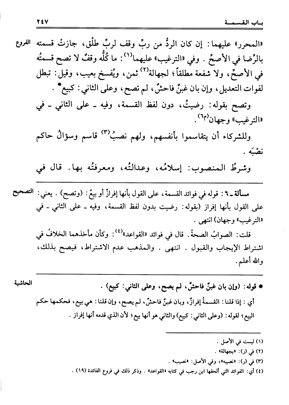 الْمُحَرَّرِ عَلَيْهِمَا: إنْ كَانَ الرَّدُّ مِنْ رَبِّ وَقْفٍ لِرَبِّ طَلْقٍ جَازَتْ قِسْمَتُهُ بِالرِّضَا فِي الْأَصَحِّ. وَفِي التَّرْغِيبِ: عَلَيْهِمَا1 مَا كُلُّهُ وَقْفٌ لَا تَصِحُّ قِسْمَتُهُ فِي الْأَصَحُّ وَلَا شُفْعَةَ مُطْلَقًا لِجَهَالَةِ2 ثَمَنٍ وَيُفْسَخُ بِعَيْبٍ وَقِيلَ: تَبْطُلُ لِفَوَاتِ التَّعْدِيلِ وَإِنْ بَانَ غَبْنٌ فَاحِشٌ لَمْ تَصِحَّ وَعَلَى الثَّانِي كَبَيْعٍ.