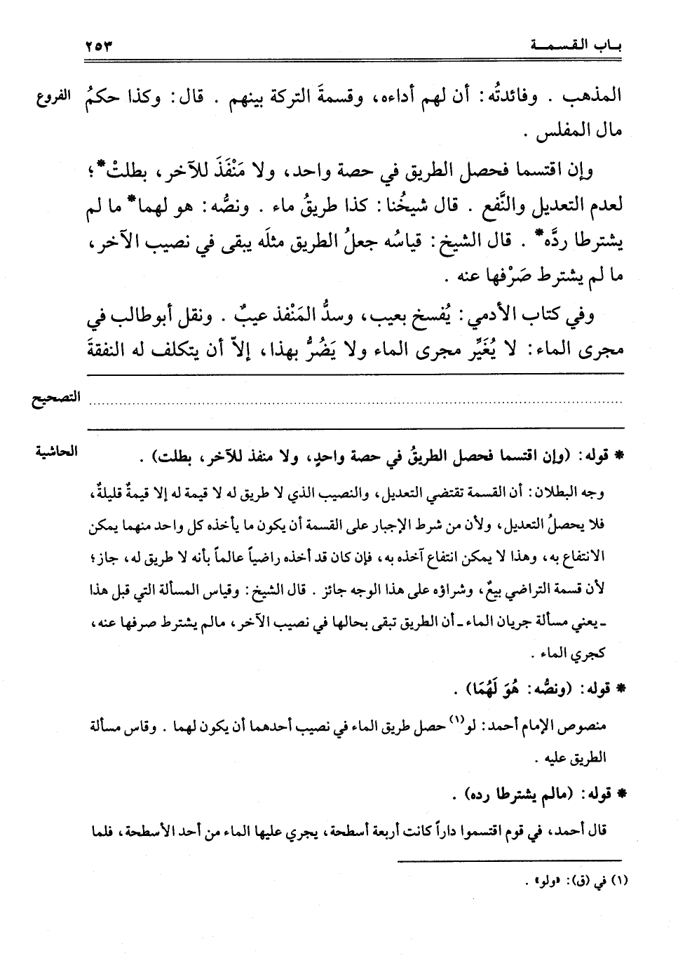 وَإِنْ اقْتَسَمَا فَحَصَلَ الطَّرِيقُ فِي حِصَّةِ وَاحِدٍ وَلَا مَنْفَذَ لِلْآخَرِ بَطَلَتْ لِعَدَمِ التَّعْدِيلِ وَالنَّفْعِ قَالَ شَيْخُنَا: كَذَا طَرِيقُ مَاءٍ وَنَصُّهُ: هُوَ لَهُمَا مَا لَمْ يَشْتَرِطَا رَدَّهُ قَالَ الشَّيْخُ: قِيَاسُهُ جَعْلُ الطَّرِيقِ مِثْلَهُ يَبْقَى فِي نَصِيبِ الْآخَرِ مَا لَمْ يَشْتَرِطْ صَرْفَهَا عَنْهُ.