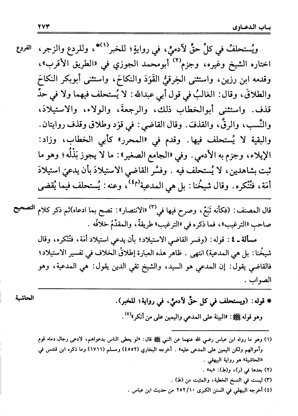 1 وهو ما رواه ابن عباس رضي الله عنهما عَنْ النَّبِيِّ صَلَّى اللَّهُ عَلَيْهِ وَسَلَّمَ قَالَ: "لو يعطى الناس بدعواهم، لادعى رجال دماء قوم وأموالهم ولكن اليمين على المدعي عليه". أخرجه البخاري 4552، ومسلم 1711، وما ذكره ابن قندس في "الحاشية" هو رواية البيهقي.