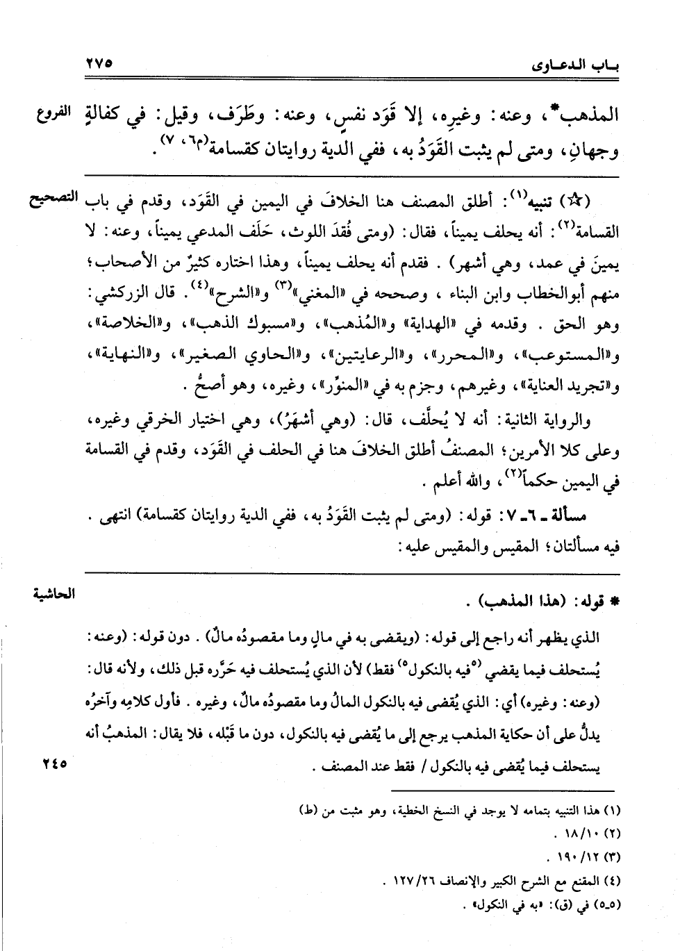 ـــــــــــــــــــــــــــــQتَنْبِيهٌ1: أَطْلَقَ الْمُصَنِّفُ هُنَا فِي الْيَمِينِ فِي الْقَوَدِ وَقَدَّمَ فِي بَابِ الْقَسَامَةِ2 أَنَّهُ يَحْلِفُ يَمِينًا فَقَالَ وَمَتَى فُقِدَ اللَّوْثُ حَلَفَ الْمُدَّعِي يَمِينًا وَعَنْهُ: لَا يَمِينَ فِي عَمْدٍ وَهِيَ أَشْهَرُ فَقُدِّمَ أَنَّهُ يَحْلِفُ يَمِينًا وَهَذَا اخْتَارَهُ كَثِيرٌ مِنْ الْأَصْحَابِ مِنْهُمْ أَبُو الْخَطَّابِ وَابْنُ الْبَنَّا وَصَحَّحَهُ فِي الْمُغْنِي3 وَالشَّرْحِ4 قَالَ الزَّرْكَشِيّ وَهُوَ الْحَقُّ وَقَدَّمَهُ فِي الْهِدَايَةِ الْمُذْهَبِ وَمَسْبُوكِ الذَّهَبِ وَالْخُلَاصَةِ وَالْمُسْتَوْعِبِ وَالْمُحَرَّرِ وَالرِّعَايَتَيْنِ وَالْحَاوِي وَالنِّهَايَةِ وَتَجْرِيدِ الْعِنَايَةِ وَغَيْرِهِمْ وَجَزَمَ بِهِ فِي الْمُنَوِّرِ وَغَيْرِهِ وَهُوَ أَصَحُّ.
