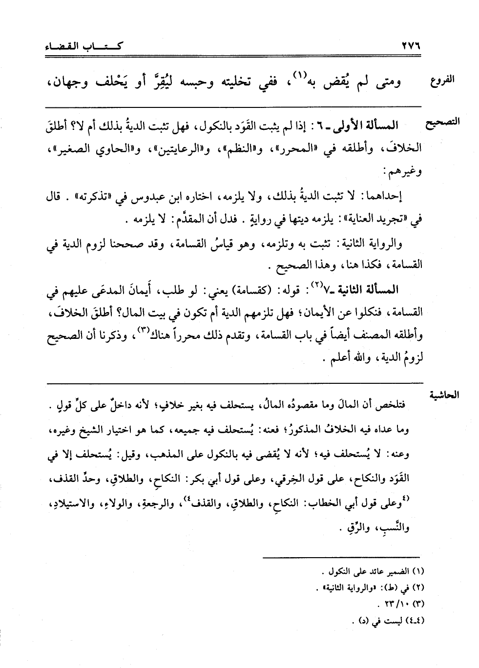 ـــــــــــــــــــــــــــــQالْمَسْأَلَةُ الْأُولَى 6: إذَا لَمْ يَثْبُتْ الْقَوَدُ بِالنُّكُولِ فَهَلْ تَثْبُت بِذَلِكَ الدِّيَةُ بِذَلِكَ أَمْ لَا؟ أَطْلَقَ الْخِلَافَ وَأَطْلَقَهُ فِي الْمُحَرَّرِ وَالنَّظْمِ وَالرِّعَايَتَيْنِ وَالْحَاوِي الصَّغِيرِ غَيْرِهِمْ: