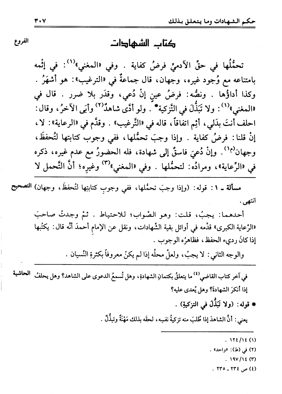 ـــــــــــــــــــــــــــــQمَسْأَلَةٌ 1: قَوْلُهُ: وَإِذَا وَجَبَ تَحَمُّلُهَا فَفِي وُجُوبِ كِتَابَتِهَا لِتُحْفَظَ وَجْهَانِ. انْتَهَى: أَحَدُهُمَا: يَجِبُ قُلْت وَهُوَ الصَّوَابُ لِلِاحْتِيَاطِ ثُمَّ وَجَدْت صَاحِبَ الرِّعَايَةِ الْكُبْرَى قَدَّمَهُ فِي أَوَائِلِ بَقِيَّةِ الشَّهَادَاتِ وَنُقِلَ عَنْ الْإِمَامِ أَحْمَدَ أَنَّهُ قَالَ: يَكْتُبُهَا إذَا كَانَ رَدِيءَ الْحِفْظِ فَظَاهِرُهُ الْوُجُوبُ.