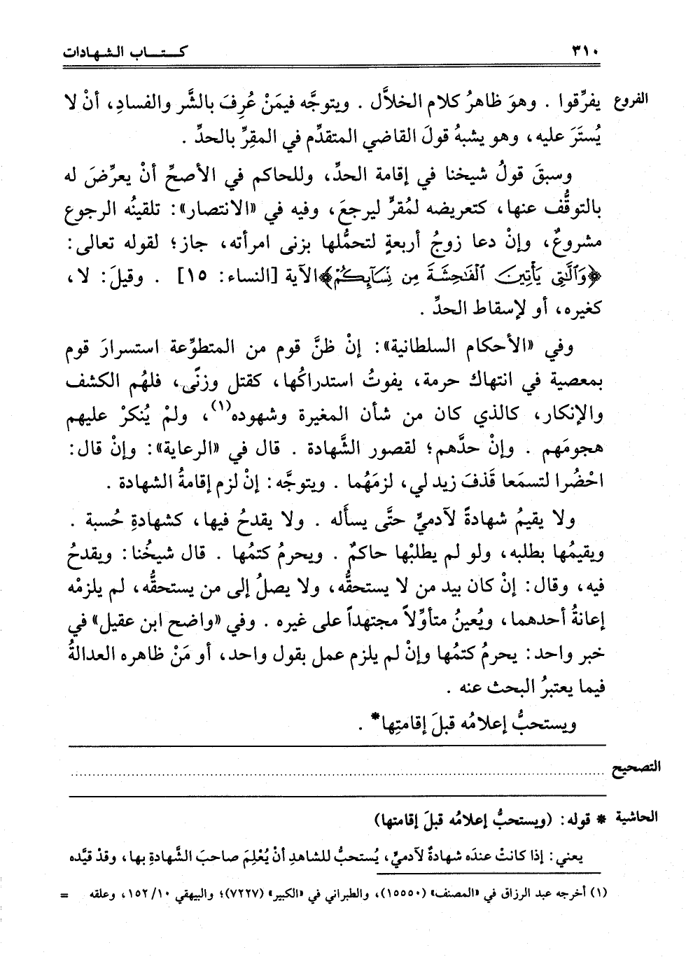 وَفِي الْأَحْكَامِ السُّلْطَانِيَّةِ إنْ ظَنَّ قَوْمٌ مِنْ الْمُتَطَوِّعَةِ اسْتِسْرَارَ قَوْمٍ بِمَعْصِيَةٍ فِي انْتِهَاك حُرْمَةٍ يَفُوتُ اسْتِدْرَاكُهَا كَقَتْلٍ وَزِنًا فَلَهُمْ الْكَشْفُ وَالْإِنْكَارُ كَاَلَّذِي كَانَ مِنْ شَأْنِ الْمُغِيرَةِ وَشُهُودِهِ1 وَلَمْ يُنْكِرْ عَلَيْهِمْ هُجُومَهُمْ وَإِنْ حَدَّهُمْ لِقُصُورِ الشَّهَادَةِ قَالَ فِي الرِّعَايَةِ: وَإِنْ قَالَ اُحْضُرَا لِتَسْمَعَا قَذْفَ زَيْدٍ لِي لَزِمَهُمَا وَيُتَوَجَّهُ إنْ لَزِمَ إقَامَةُ الشَّهَادَةِ.