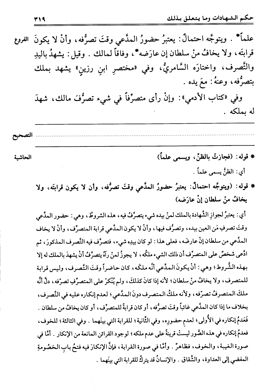 عِلْمًا وَيُتَوَجَّهُ احْتِمَالٌ: يُعْتَبَرُ حُضُورُ الْمُدَّعِي وَقْتَ تَصَرُّفِهِ وَأَنْ لَا يَكُونَ قَرَابَتَهُ وَلَا يَخَافُ مِنْ سُلْطَانٍ إنْ عَارَضَهُ وِفَاقًا لِمَالِكٍ وَقِيلَ يَشْهَدُ بِالْيَدِ وَالتَّصَرُّفِ وَاخْتَارَهُ السَّامِرِيُّ وَفِي مُخْتَصَرِ ابْنِ رَزِينٍ يَشْهَدُ بِمِلْكٍ بِتَصَرُّفِهِ وَعَنْهُ: مَعَ يَدِهِ.