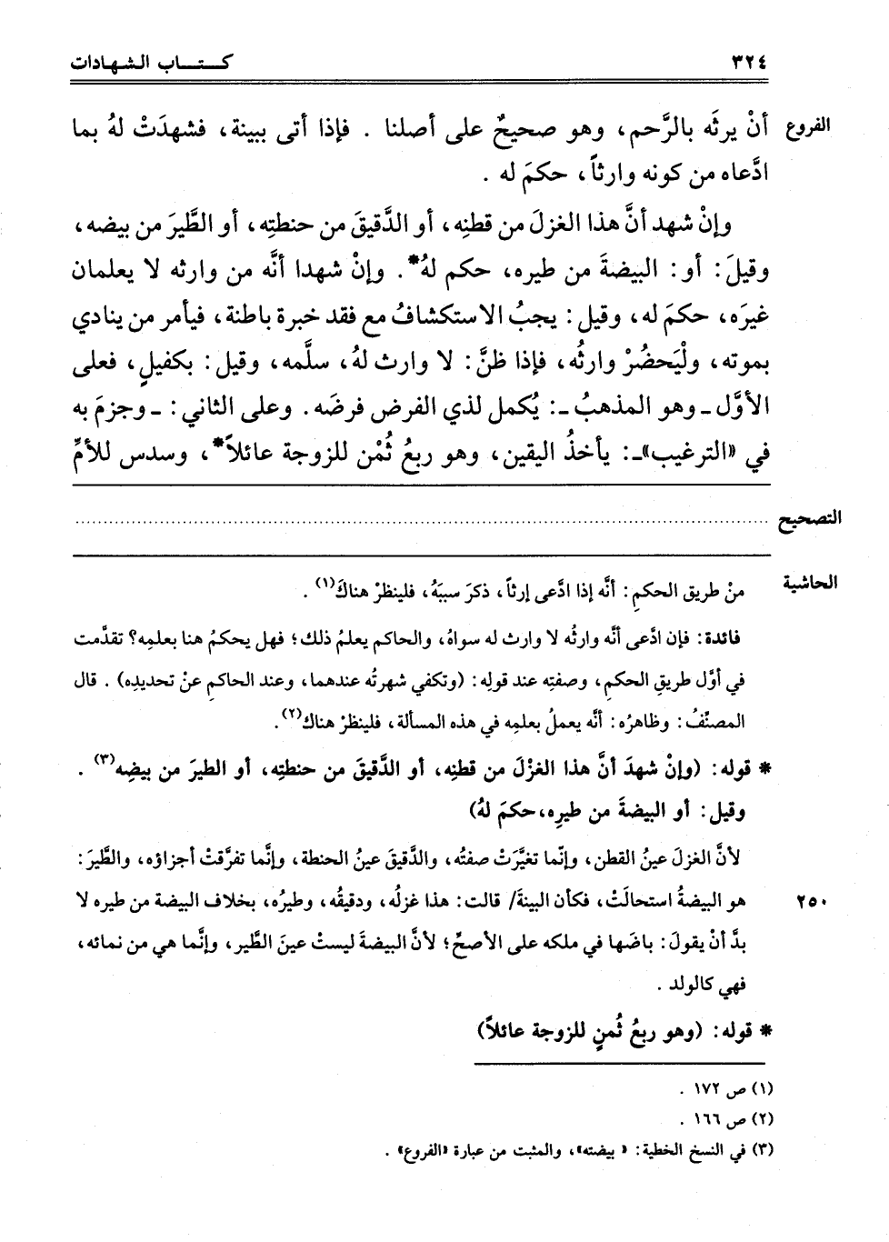 وَإِنْ شَهِدَ أَنَّ هَذَا الْغَزْلَ مِنْ قُطْنِهِ أَوْ الدَّقِيقَ مِنْ حِنْطَتِهِ أَوْ الطَّيْرَ مِنْ بَيْضِهِ وَقِيلَ: أَوْ الْبَيْضَةَ مِنْ طَيْرِهِ حَكَمَ لَهُ وَإِنْ شَهِدَا أَنَّهُ وَارِثُهُ لَا يَعْلَمَانِ غَيْرَهُ حَكَمَ لَهُ وَقِيلَ: يَجِبُ الِاسْتِكْشَافُ مَعَ فَقْدِ خِبْرَةٍ بَاطِنَةٍ فَيَأْمُرُ مَنْ يُنَادِي بِمَوْتِهِ وَلْيَحْضُرْ وَارِثُهُ فَإِذَا ظَنَّ لَا وَارِثَ لَهُ سَلَّمَهُ وَقِيلَ: بِكَفِيلٍ فَعَلَى الْأَوَّلِ وَهُوَ الْمَذْهَبُ يُكْمِلُ لِذِي الْفَرْضِ فَرْضَهُ وَعَلَى الثَّانِي وَجَزَمَ بِهِ فِي التَّرْغِيبِ يَأْخُذُ الْيَقِينَ وَهُوَ رُبُعُ ثُمُنٍ لِلزَّوْجَةِ عَائِلًا وَسُدُسٌ لِلْأُمِّ