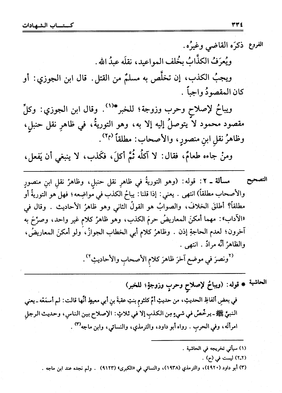 ـــــــــــــــــــــــــــــQمَسْأَلَةٌ 2: قَوْلُهُ: وَهُوَ التَّوْرِيَةُ فِي ظَاهِرِ نَقْلِ حنبل وظاهر نقل ابن منصور والأصحاب مطلقا انْتَهَى. يَعْنِي إذَا قُلْنَا يُبَاحُ الْكَذِبُ فِي مَوَاضِعِهِ فَهَلْ هُوَ التَّوْرِيَةُ أَوْ مُطْلَقًا أَطْلَقَ الْخِلَافَ وَالصَّوَابُ هُوَ الْقَوْلُ الثَّانِي هُوَ ظَاهِرُ الْأَحَادِيثِ. وَقَالَ فِي الْآدَابِ مَهْمَا أَمْكَنَ الْمَعَارِيضُ حَرُمَ الْكَذِبُ وَهُوَ ظَاهِرُ كَلَامِ غَيْرِ وَاحِدٍ وَصَرَّحَ بِهِ آخَرُونَ لِعَدَمِ الْحَاجَةِ إذَنْ وَظَاهِرُ كَلَامِ أَبِي الْخَطَّابِ الْجَوَازُ وَلَوْ أَمْكَنَ الْمَعَارِيضُ وَالظَّاهِرُ أَنَّهُ مُرَادٌ انْتَهَى.