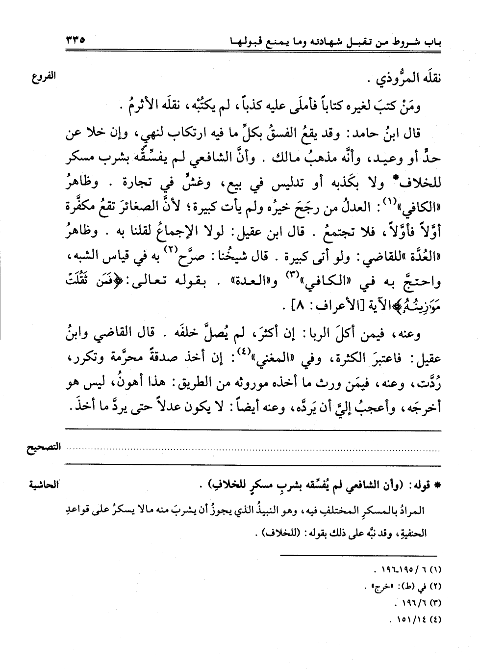 قَالَ ابْنُ حَامِدٍ: وَقَدْ يَقَعُ الْفِسْقُ بِكُلِّ مَا فِيهِ ارْتِكَابٌ لِنَهْيٍ وَإِنْ خَلَا عَنْ حَدٍّ أَوْ وَعِيدٍ وَأَنَّهُ مَذْهَبُ مَالِكٍ وَأَنَّ الشَّافِعِيَّ لَمْ يُفَسِّقْهُ بِشُرْبِ مُسْكِرٍ لِلْخِلَافِ وَلَا بِكَذِبَةٍ أَوْ تَدْلِيسٍ فِي بَيْعٍ وَغِشٍّ فِي تِجَارَةٍ. وَظَاهِرُ الْكَافِي1: الْعَدْلُ مَنْ رَجَحَ خَيْرُهُ وَلَمْ يَأْتِ كَبِيرَةً لِأَنَّ الصَّغَائِرَ تَقَعُ مُكَفِّرَةً أَوَّلًا فَأَوَّلًا فَلَا تَجْتَمِعُ. قَالَ ابْنُ عَقِيلٍ: لَوْلَا الْإِجْمَاعُ لَقُلْنَا بِهِ وَظَاهِرُ الْعُدَّةِ لِلْقَاضِي: وَلَوْ أتى كبيرة قال شيخنا: صرح2 به في قياس الشبه واحتج فِي الْكَافِي3 وَالْعُدَّةِ بِقَوْلِهِ تَعَالَى: {فَمَنْ ثَقُلَتْ مَوَازِينُهُ} الآية [الأعراف: 8] .