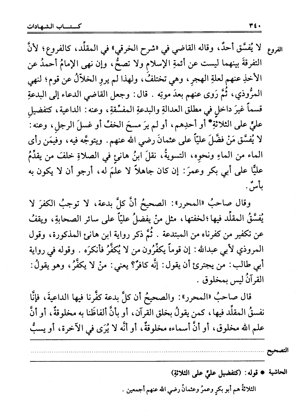 وَقَالَ صَاحِبُ الْمُحَرَّرِ: الصَّحِيحُ أَنَّ كُلَّ بِدْعَةٍ لَا تُوجِبُ الْكُفْرَ لَا يَفْسُقُ الْمُقَلِّدُ فِيهَا لِخِفَّتِهَا مِثْلُ مَنْ يُفَضِّلُ عَلِيًّا عَلَى سَائِرِ الصَّحَابَةِ وَيَقِفُ عَنْ تَكْفِيرِ مَنْ كَفَّرْنَاهُ مِنْ الْمُبْتَدَعَةِ ثُمَّ ذَكَرَ رِوَايَةَ ابْنِ هَانِئٍ الْمَذْكُورَةَ وَقَوْلَ الْمَرُّوذِيِّ لِأَبِي عَبْدِ اللَّهِ: إنَّ قَوْمًا يُكَفِّرُونَ مَنْ لَا يُكَفِّرُ فَأَنْكَرَهُ وَقَوْلُهُ فِي رِوَايَةِ أَبِي طَالِبٍ: مَنْ يَجْتَرِئُ أَنْ يَقُولَ إنَّهُ كَافِرٌ؟ يَعْنِي مَنْ لَا يَكْفُرُ وَهُوَ يَقُولُ: الْقُرْآنُ لَيْسَ بِمَخْلُوقٍ.