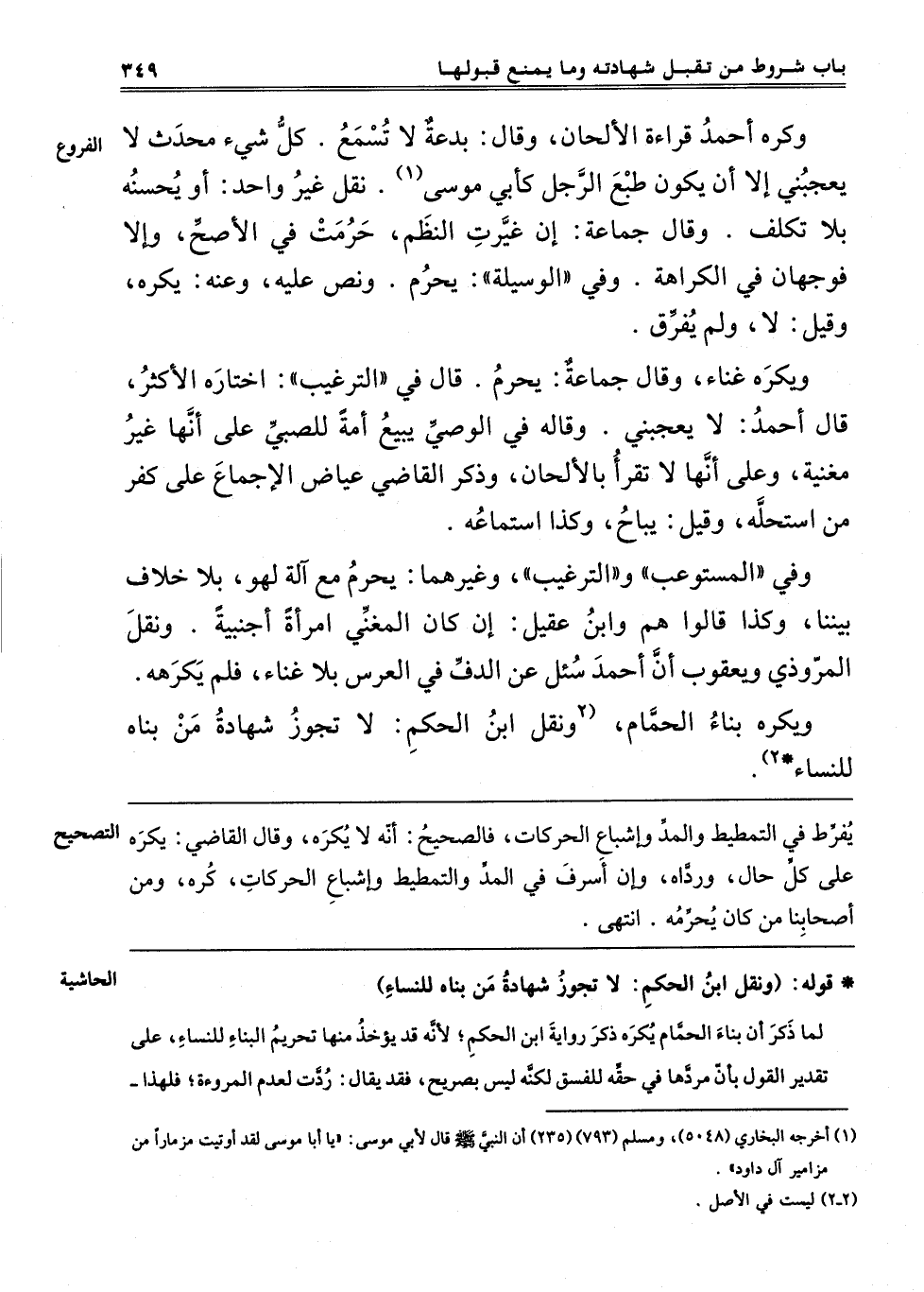 وَفِي الْمُسْتَوْعِبِ وَالتَّرْغِيبِ وَغَيْرِهِمَا: يَحْرُمُ مَعَ آلَةِ لَهْوٍ بِلَا خِلَافٍ بَيْنَنَا وَكَذَا قَالُوا هُمْ وَابْنُ عَقِيلٍ: إنْ كَانَ الْمُغَنِّي امْرَأَةً أَجْنَبِيَّةً وَنَقَلَ الْمَرُّوذِيُّ وَيَعْقُوبُ: أَنَّ أَحْمَدَ سُئِلَ عَنْ الدُّفِّ فِي الْعُرْسِ بِلَا غِنَاءٍ فَلَمْ يَكْرَهْهُ. وَيُكْرَهُ بِنَاءُ الْحَمَّامِ "2وَنَقَلَ ابْنُ الْحَكَمِ: لَا تَجُوزُ شَهَادَةُ مَنْ بَنَاهُ لِلنِّسَاءِ2".