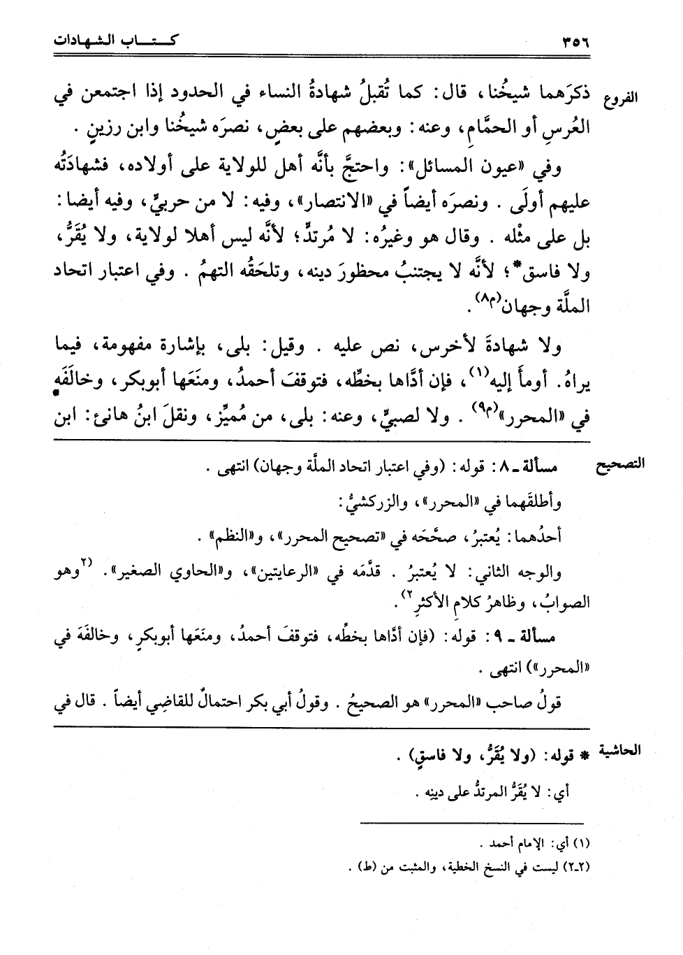 وَفِي عُيُونِ الْمَسَائِلِ: وَاحْتَجَّ بِأَنَّهُ أَهْلٌ لِلْوِلَايَةِ عَلَى أَوْلَادِهِ فَشَهَادَتُهُ عَلَيْهِمْ أَوْلَى وَنَصَرَهُ أَيْضًا فِي الِانْتِصَارِ وَفِيهِ: لَا مِنْ حَرْبِيٍّ. وَفِيهِ أَيْضًا: بَلْ عَلَى مِثْلِهِ وَقَالَ: هُوَ وَغَيْرُهُ لَا مُرْتَدٌّ لِأَنَّهُ لَيْسَ أَهْلًا لِوِلَايَةٍ وَلَا يُقِرُّ وَلَا فَاسِقٍ لِأَنَّهُ لَا يَجْتَنِبُ مَحْظُورَ دِينِهِ وَتَلْحَقُهُ التُّهْمَةُ وَفِي اعْتِبَارِ اتِّحَادِ الْمِلَّةِ وَجْهَانِ م 8.