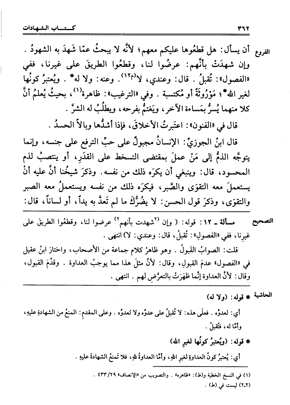 ـــــــــــــــــــــــــــــQمسألة 12: قوله: وَإِنْ "2شَهِدَتْ بِأَنَّهُمْ2" عَرَضُوا لَنَا وَقَطَعُوا الطَّرِيقَ عَلَى غَيْرِنَا فَفِي الْفُصُولِ: تُقْبَلُ قَالَ: وَعِنْدِي: لَا. انْتَهَى. قُلْت: الصَّوَابُ: الْقَبُولُ وَهُوَ ظَاهِرُ كَلَامِ جَمَاعَةٍ مِنْ الْأَصْحَابِ وَاخْتَارَ ابْنُ عَقِيلٍ فِي الْفُصُولِ عَدَمَ الْقَبُولِ وَقَالَ: لِأَنَّ مِثْلَ هَذَا مِمَّا يُوجِبُ الْعَدَاوَةَ وَقَدَّمَ الْقَبُولَ وَقَالَ: لِأَنَّ الْعَدَاوَةَ إنَّمَا ظَهَرَتْ بِالتَّعَرُّضِ لَهُمْ انْتَهَى.