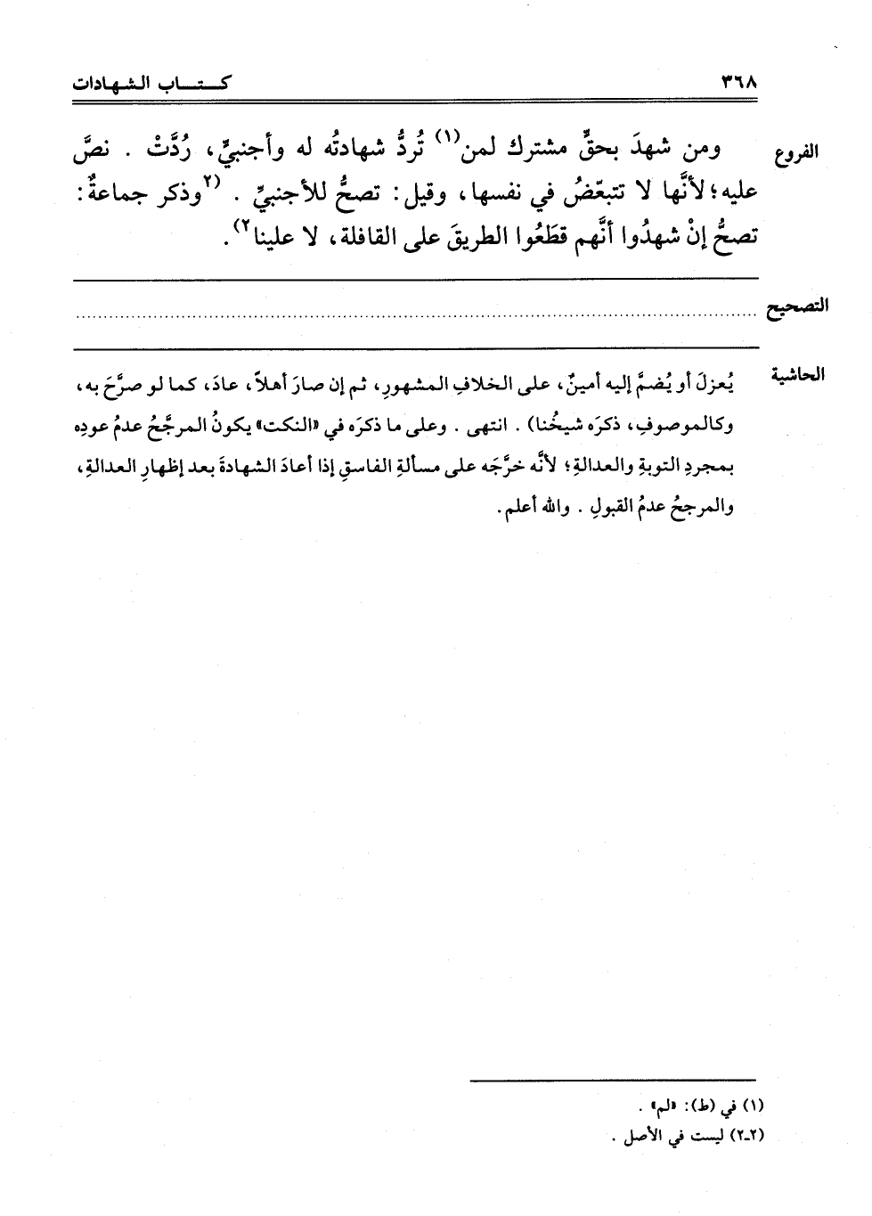 ومن شهد بحق مشترك لمن1 تُرَدَّ شَهَادَتُهُ لَهُ وَأَجْنَبِيٌّ رُدَّتْ نَصَّ عَلَيْهِ لِأَنَّهَا لَا تَتَبَعَّضُ فِي نَفْسِهَا وَقِيلَ: تَصِحُّ لِلْأَجْنَبِيِّ. 2وَذَكَرَ جَمَاعَةٌ تَصِحُّ إنْ شَهِدُوا أَنَّهُمْ قطعوا الطريق على القافلة لا علينا.