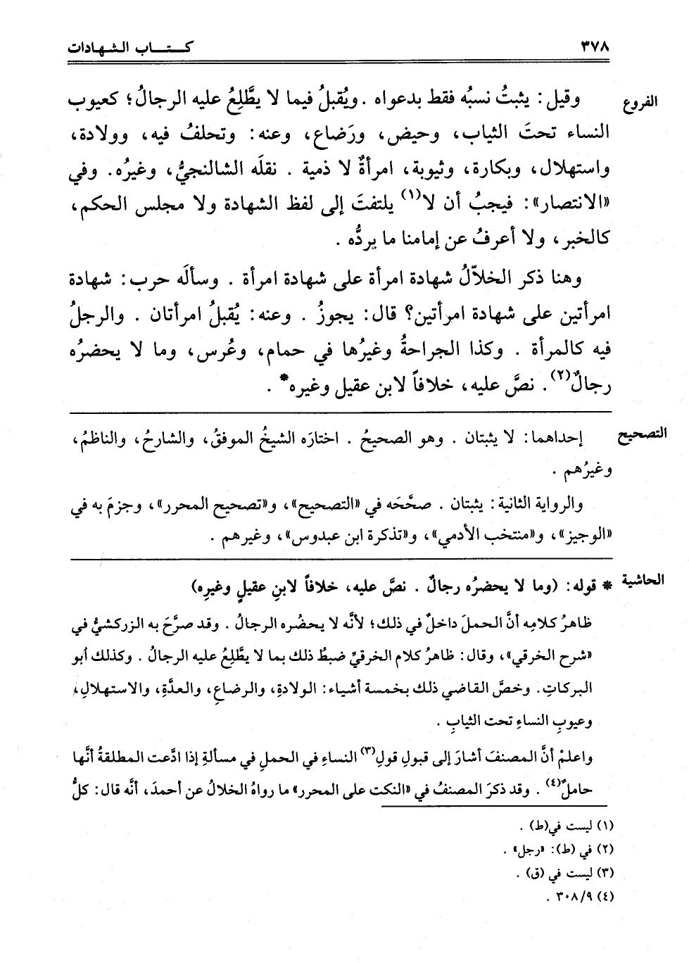 وَقِيلَ: يَثْبُتُ نَسَبُهُ فَقَطْ بِدَعْوَاهُ وَيُقْبَلُ فِيمَا لَا يَطَّلِعُ عَلَيْهِ الرِّجَالُ كَعُيُوبِ النِّسَاءِ تَحْتَ الثِّيَابِ وَحَيْضٍ وَرِضَاعٍ وَعَنْهُ: وَتَحْلِفُ فِيهِ وَوِلَادَةٍ وَاسْتِهْلَالٍ وَبَكَارَةٍ وَثُيُوبَةِ امْرَأَةٍ لَا ذِمِّيَّةٍ نَقَلَهُ الشالنجي وغيره. وفي الانتصار: فيجب أن لا1 يَلْتَفِتَ إلَى لَفْظِ الشَّهَادَةِ وَلَا مَجْلِسَ الْحُكْمِ وَكَالْخَبَرِ وَلَا أَعْرِفُ عَنْ إمَامِنَا مَا يَرُدُّهُ. وَهُنَا ذَكَرَ الْخَلَّالُ شَهَادَةَ امْرَأَةٍ عَلَى شَهَادَةِ امْرَأَةٍ وَسَأَلَهُ حَرْبٌ شَهَادَةَ امْرَأَتَيْنِ عَلَى شَهَادَةِ امْرَأَتَيْنِ؟ قَالَ: يَجُوزُ وَعَنْهُ: يُقْبَلُ امْرَأَتَانِ وَالرَّجُلُ فيه كالمرأة وَكَذَا الْجِرَاحَةُ وَغَيْرُهَا فِي حَمَّامٍ وَعُرْسٍ وَمَا لَا يَحْضُرُهُ رِجَالٌ2 نَصَّ عَلَيْهِ خِلَافًا لِابْنِ عقيل وغيره.