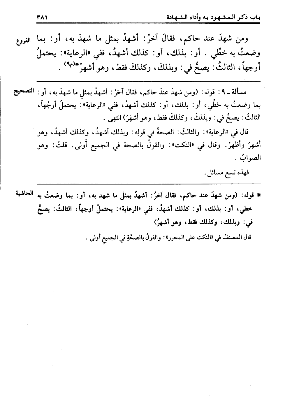 ـــــــــــــــــــــــــــــQمَسْأَلَة 9: قَوْلُهُ: وَمَنْ شَهِدَ عِنْدَ حَاكِمٍ فَقَالَ آخَرُ أَشْهَدُ بِمِثْلِ مَا شَهِدَ بِهِ أَوْ بِمَا وَضَعْت بِهِ خَطِّي أَوْ بِذَلِكَ أَوْ كَذَلِكَ أَشْهَدُ. فَفِي الرِّعَايَةِ يُحْتَمَلُ أَوْجُهًا الثَّالِثُ يَصِحُّ فِي: وَبِذَلِكَ وَكَذَلِكَ فَقَطْ وَهُوَ أَشْهَرُ. انْتَهَى. قَالَ فِي الرِّعَايَةِ: وَالثَّالِثُ: الصِّحَّةُ فِي قَوْلِهِ: وَبِذَلِكَ أَشْهَدُ وَكَذَلِكَ أَشْهَدُ وَهُوَ أَشْهَرُ وَأَظْهَرُ. وَقَالَ فِي النُّكَتِ: وَالْقَوْلُ بِالصِّحَّةِ فِي الْجَمِيعِ أَوْلَى. قُلْت: وَهُوَ الصَّوَابُ.