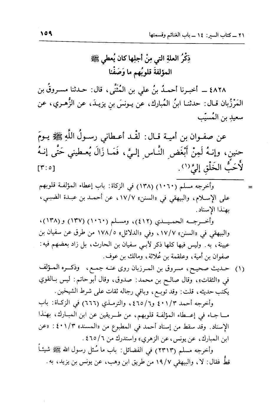 4828 - أَخْبَرَنَا أَحْمَدُ بْنُ عَلِيِّ بْنِ الْمُثَنَّى، قَالَ: حَدَّثَنَا مَسْرُوقُ بْنُ الْمَرْزُبَانِ، قَالَ: حَدَّثَنَا ابْنُ الْمُبَارَكِ، عَنْ يُونُسَ بْنِ يَزِيدَ، عَنِ الزُّهْرِيِّ، عَنْ سَعِيدِ بْنِ الْمُسَيِّبِ، عَنْ صَفْوَانَ بْنِ أُمَيَّةَ، قَالَ: «لَقَدْ أَعْطَانِي رَسُولُ اللَّهِ صَلَّى اللَّهُ عَلَيْهِ وَسَلَّمَ، يَوْمَ حُنَيْنٍ، وَإِنَّهُ لَمِنْ أَبْغَضِ النَّاسِ إِلَيَّ فَمَا زَارَ يُعْطِينِي حَتَّى إِنَّهُ لَأَحَبُّ الْخَلْقِ إِلَيَّ» (¬1) . [5: 3]