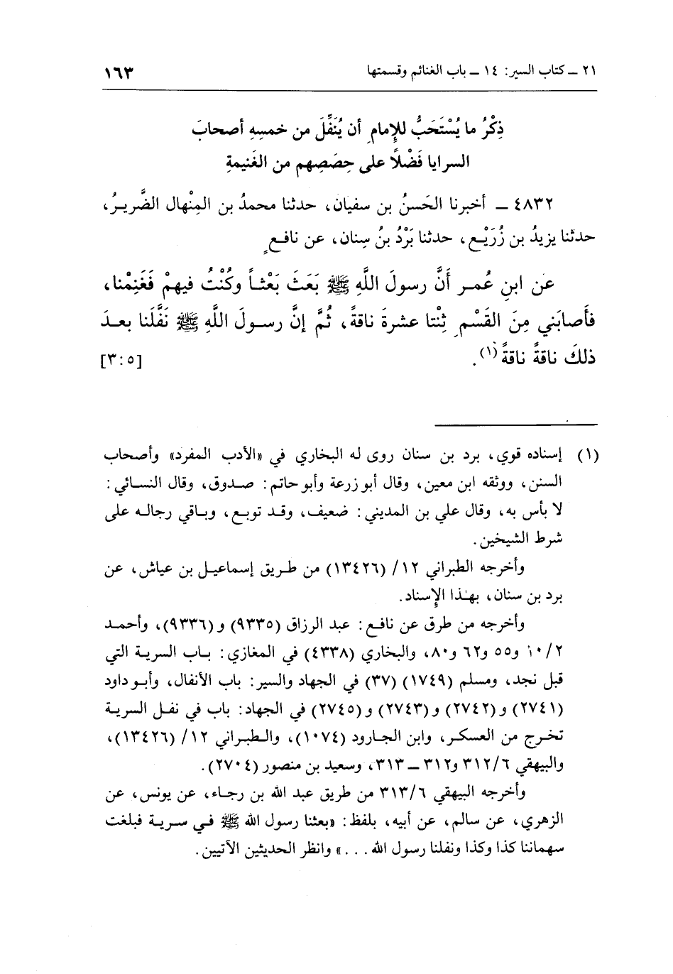 4832 - أَخْبَرَنَا الْحَسَنُ بْنُ سُفْيَانَ، حَدَّثَنَا مُحَمَّدُ بْنُ الْمِنْهَالِ الضَّرِيرُ، حَدَّثَنَا يَزِيدُ بْنُ زُرَيْعٍ، حَدَّثَنَا بُرْدُ بْنُ سِنَانٍ، عَنْ نَافِعٍ، عَنِ ابْنِ عُمَرَ، «أَنَّ رَسُولَ اللَّهِ صَلَّى اللَّهُ عَلَيْهِ وَسَلَّمَ، بَعَثَ بَعْثًا وَكُنْتُ فِيهِمْ، فَغَنِمْنَا، فَأَصَابَنِي مِنَ الْقَسَمِ ثِنْتَا عَشْرَةَ نَاقَةً، ثُمَّ إِنَّ رَسُولَ اللَّهِ صَلَّى اللَّهُ عَلَيْهِ وَسَلَّمَ نَفَّلَنَا بَعْدَ ذَلِكَ نَاقَةً، نَاقَةً» (¬1) . [5: 3]