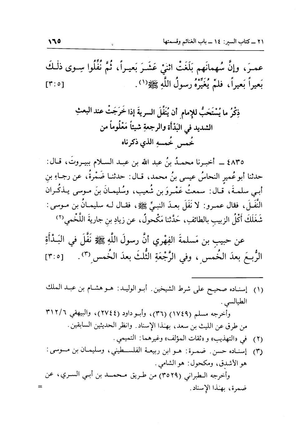 عَنْ حَبِيبِ بْنِ مَسْلَمَةَ الْفِهْرِيِّ، «أَنَّ رَسُولَ اللَّهِ صَلَّى اللَّهُ عَلَيْهِ وَسَلَّمَ، نَفَّلَ فِي الْبَدْأَةِ الرُّبُعَ بَعْدَ الْخُمُسِ، وَفِي الرَّجْعَةِ الثُّلُثَ بَعْدَ الْخُمُسِ» (¬3) . [5: 3]