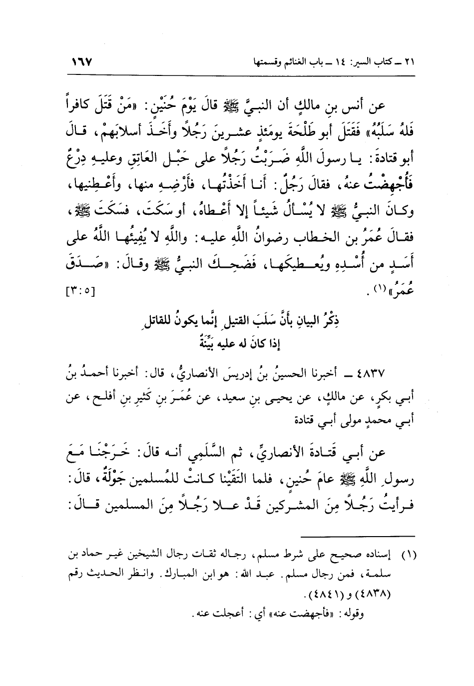 عَنْ أَنَسِ بْنِ مَالِكٍ، أَنَّ النَّبِيَّ صَلَّى اللَّهُ عَلَيْهِ وَسَلَّمَ قَالَ يَوْمَ حُنَيْنٍ: «مَنْ قَتَلَ كَافِرًا، فَلَهُ سَلَبُهُ» ، فَقَتَلَ أَبُو طَلْحَةَ يَوْمَئِذٍ عِشْرِينَ رَجُلًا، وَأَخَذَ أَسْلَابَهُمْ، قَالَ أَبُو قَتَادَةَ: يَا رَسُولَ اللَّهِ ضَرَبْتُ رَجُلًا عَلَى حَبْلِ الْعَاتِقِ وَعَلَيْهِ دِرْعٌ، فَأُجْهِضْتُ عَنْهُ، فَقَالَ رَجُلٌ: أَنَا أَخَذْتُهَا، فَأَرْضِهِ مِنْهَا وَأَعْطِنِيهَا، وَكَانَ النَّبِيُّ صَلَّى اللَّهُ عَلَيْهِ وَسَلَّمَ، لَا يُسْأَلُ شَيْئًا، أَلَا أَعْطَاهُ، أَوْ سَكَتَ، فَسَكَتَ صَلَّى اللَّهُ عَلَيْهِ وَسَلَّمَ، فَقَالَ عُمَرُ بْنُ الْخَطَّابِ رِضْوَانُ اللَّهِ عَلَيْهِ: وَاللَّهِ لَا يُفِيئُهَا اللَّهُ عَلَى أَسَدٍ مِنْ أُسْدِهِ، وَيُعْطِيكَهَا، فَضَحِكَ النَّبِيُّ صَلَّى اللَّهُ عَلَيْهِ وَسَلَّمَ، وَقَالَ: «صَدَقَ عُمَرُ» (¬1) . [5: 3]