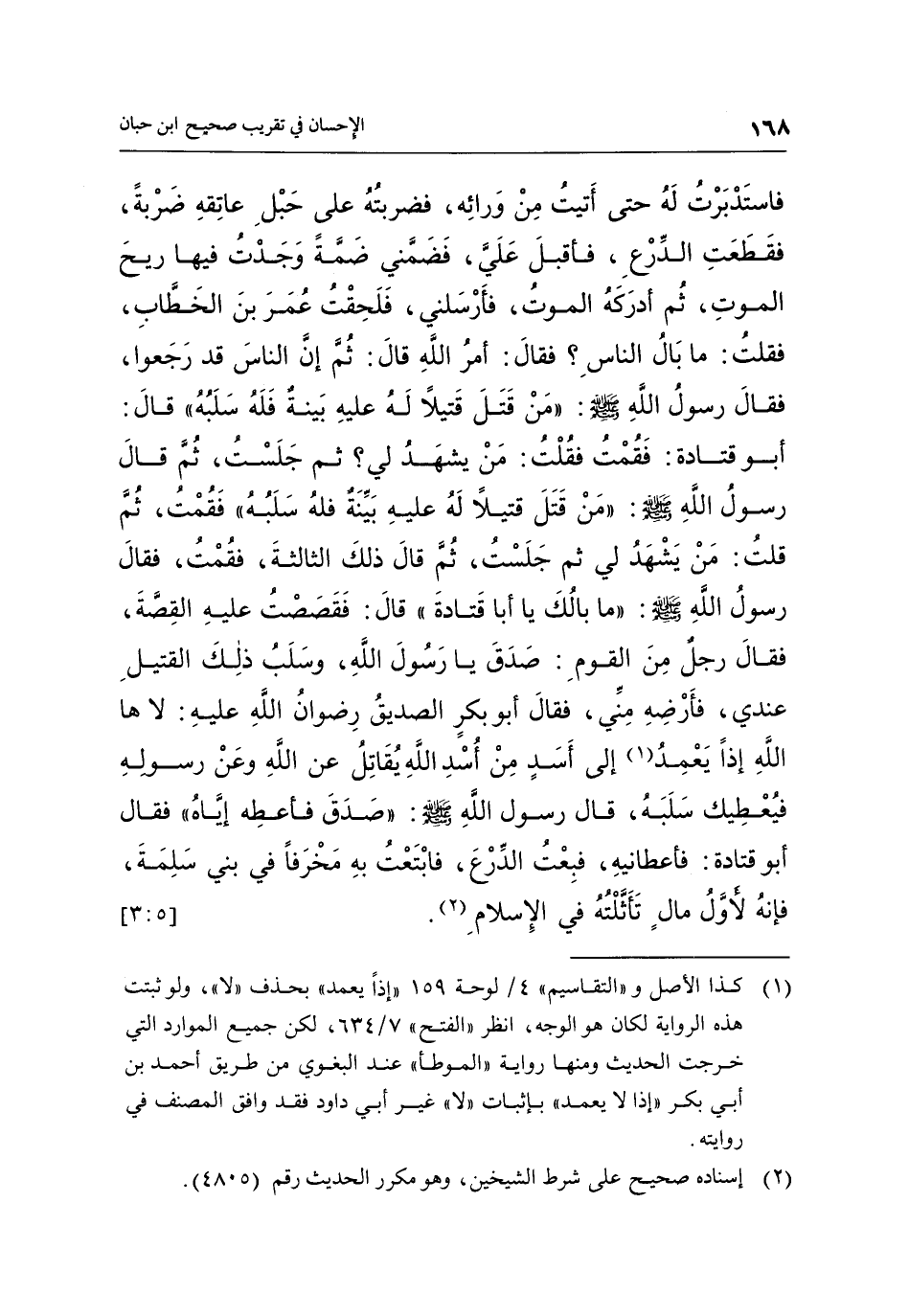 فَاسْتَدْبَرْتُ لَهُ، حَتَّى أَتَيْتُ مِنْ وَرَائِهِ، فَضَرَبْتُهُ عَلَى حَبْلِ عَاتِقِهِ ضَرْبَةً فَقَطَعْتُ الدِّرْعَ، فَأَقْبَلَ عَلَيَّ فَضَمَّنِي ضَمَّةً وَجَدْتُ فِيهَا رِيحَ الْمَوْتِ، ثُمَّ أَدْرَكَهُ الْمَوْتُ فَأَرْسَلَنِي، فَلَحِقْتُ عُمَرَ بْنَ الْخَطَّابِ، فَقُلْتُ: مَا بَالُ النَّاسِ؟، فَقَالَ: أَمْرُ اللَّهِ، قَالَ: ثُمَّ إِنَّ النَّاسَ قَدْ رَجَعُوا، فَقَالَ رَسُولُ اللَّهِ صَلَّى اللَّهُ عَلَيْهِ وَسَلَّمَ: «مَنْ قَتَلَ قَتِيلًا لَهُ عَلَيْهِ بَيِّنَةٌ، فَلَهُ سَلَبُهُ» ، قَالَ أَبُو قَتَادَةَ: فَقُمْتُ فَقُلْتُ: مَنْ يَشْهَدُ لِي؟، ثُمَّ جَلَسْتُ، ثُمَّ قَالَ رَسُولُ اللَّهِ صَلَّى اللَّهُ عَلَيْهِ وَسَلَّمَ: «مَنْ قَتَلَ قَتِيلًا لَهُ، عَلَيْهِ بَيِّنَةٌ، فَلَهُ سَلَبُهُ» ، فَقُمْتُ، ثُمَّ قُلْتُ: مَنْ يَشْهَدُ لِي، ثُمَّ جَلَسْتُ، ثُمَّ قَالَ ذَلِكَ الثَّالِثَةَ، فَقُمْتُ، فَقَالَ رَسُولُ اللَّهِ صَلَّى اللَّهُ عَلَيْهِ وَسَلَّمَ: «مَا بَالُكَ يَا أَبَا قَتَادَةَ» ، قَالَ: فَقَصَصْتُ عَلَيْهِ الْقِصَّةَ، فَقَالَ رَجُلٌ مِنَ الْقَوْمِ: صَدَقَ يَا رَسُولَ اللَّهِ وَسَلَبُ ذَلِكَ الْقَتِيلِ عِنْدِي، فَأَرْضِهِ مِنِّي، فَقَالَ: أَبُو بَكْرٍ الصِّدِّيقُ رِضْوَانُ اللَّهِ عَلَيْهِ: لَاهَا اللَّهِ، إِذًا يَعْمِدُ (¬1) إِلَى أَسَدٍ مِنْ أُسْدِ اللَّهِ يُقَاتِلُ عَنِ اللَّهِ، وَعَنْ رَسُولِهِ، فَيُعْطِيكَ سَلَبَهُ، قَالَ رَسُولُ اللَّهِ صَلَّى اللَّهُ عَلَيْهِ وَسَلَّمَ: «صَدَقَ فَأَعْطِهِ إِيَّاهُ» ، فَقَالَ أَبُو قَتَادَةَ: فَأَعْطَانِيهِ، فَبِعْتُ الدِّرْعَ، فَابْتَعْتُ بِهِ مَخْرَفًا فِي بَنِي سَلَمَةَ، فَإِنَّهُ لَأَوَّلُ مَالٍ تَأَثَّلْتُهُ فِي الْإِسْلَام (¬2) . [5: 3]