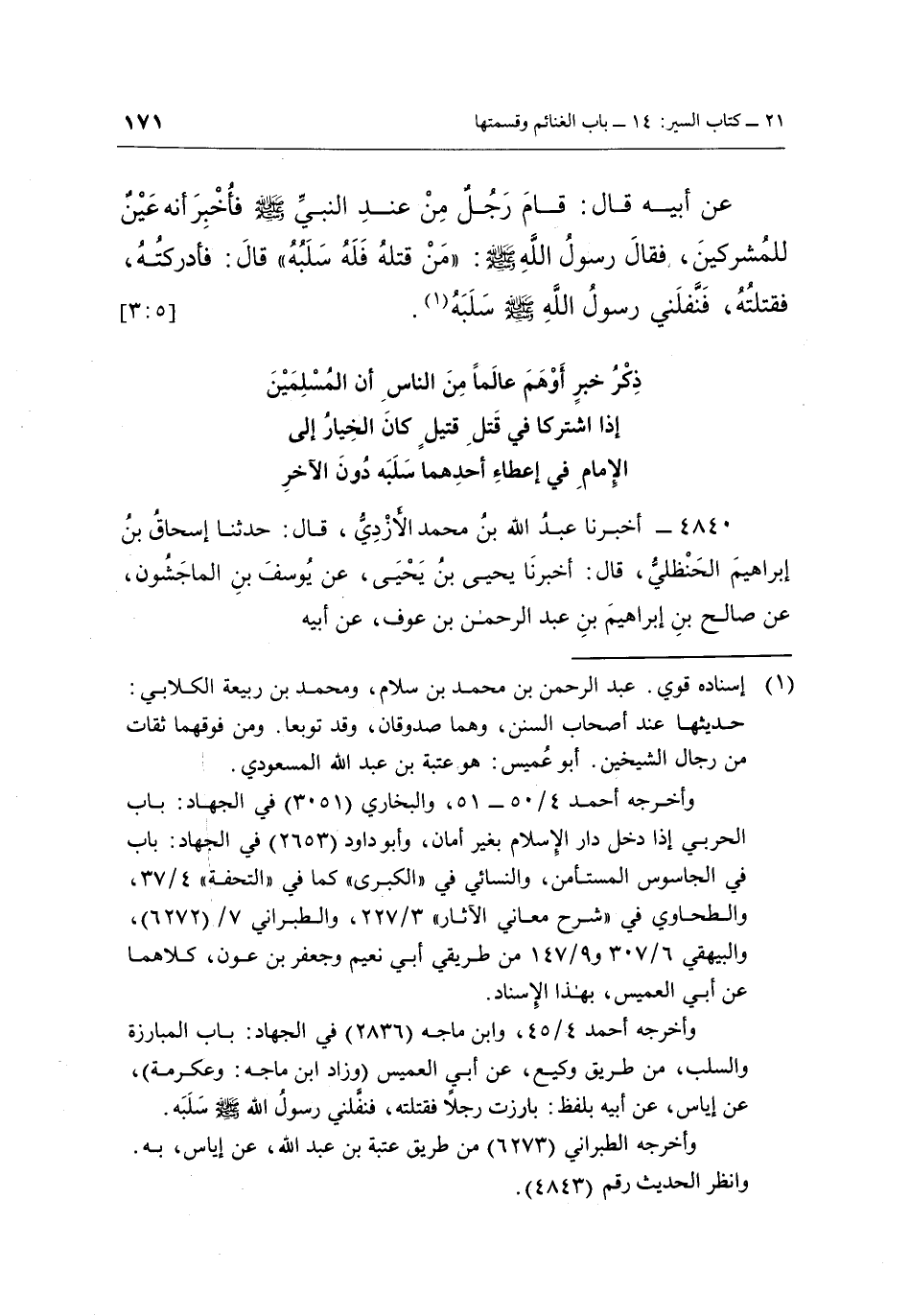 عَنْ أَبِيهِ، قَالَ: قَامَ رَجُلٌ مِنْ عِنْدِ النَّبِيِّ صَلَّى اللَّهُ عَلَيْهِ وَسَلَّمَ، فَأُخْبِرَ أَنَّهُ عَيْنٌ لِلْمُشْرِكِينَ، فَقَالَ رَسُولُ اللَّهِ صَلَّى اللَّهُ عَلَيْهِ وَسَلَّمَ: «مَنْ قَتَلَهُ، فَلَهُ سَلَبُهُ» (¬1) . [5: 3]