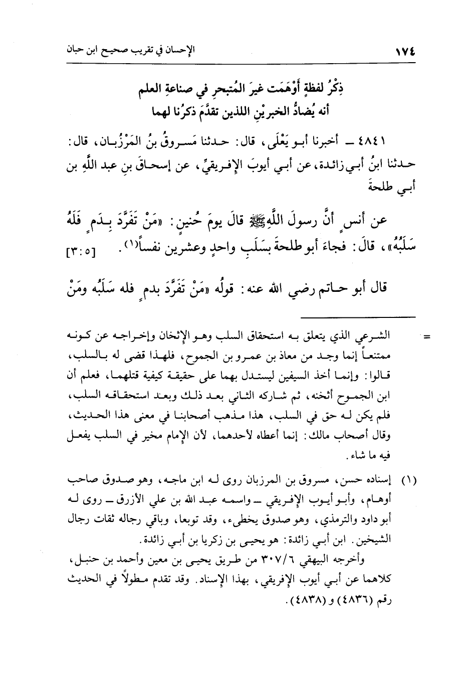 4841 - أَخْبَرَنَا أَبُو يَعْلَى، قَالَ: حَدَّثَنَا مَسْرُوقُ بْنُ الْمَرْزُبَانِ، قَالَ: حَدَّثَنَا ابْنُ أَبِي زَائِدَةَ، عَنْ أَبِي أَيُّوبَ الْإِفْرِيقِيِّ، عَنْ إِسْحَاقَ بْنِ عَبْدِ اللَّهِ بْنِ أَبِي طَلْحَةَ، عَنْ أَنَسٍ أَنَّ رَسُولَ اللَّهِ صَلَّى اللَّهُ عَلَيْهِ وَسَلَّمَ قَالَ يَوْمَ حُنَيْنٍ: «مَنْ تَفَرَّدَ بِدَمٍ فَلَهُ سَلَبُهُ» ، قَالَ فَجَاءَ أَبُو طَلْحَةَ بِسَلَبٍ وَاحِدٍ وَعِشْرِينَ نَفْسًا (¬1) . [5: 3]