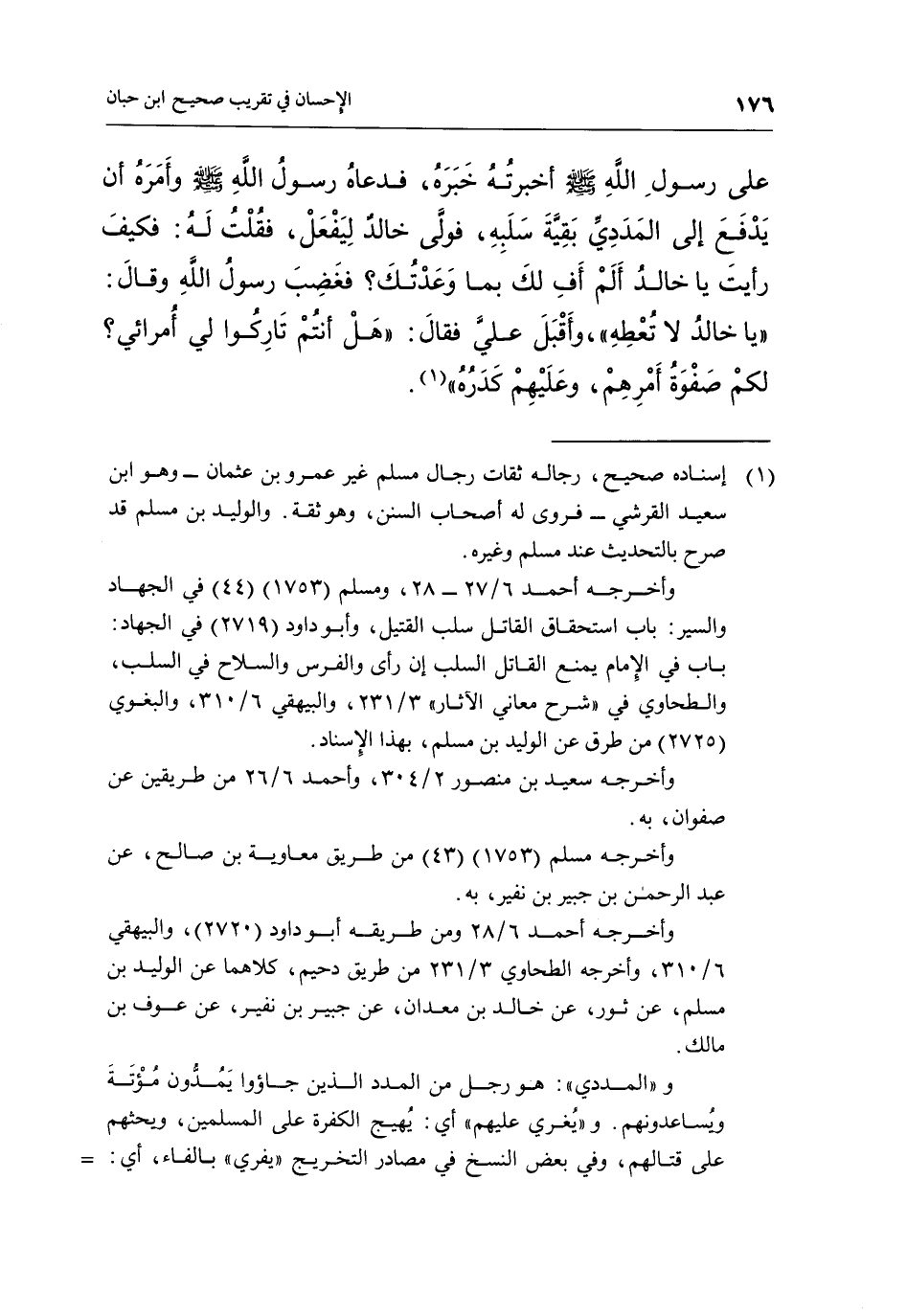 عَلَى رَسُولِ اللَّهِ صَلَّى اللَّهُ عَلَيْهِ وَسَلَّمَ، أَخْبَرَتْهُ خَبَرَهُ، فَدَعَاهُ رَسُولُ اللَّهِ صَلَّى اللَّهُ عَلَيْهِ وَسَلَّمَ، وَأَمَرَهُ أَنْ يَدْفَعَ إِلَى الْمَدَدِيِّ بَقِيَّةَ سَلَبِهِ، فَوَلَّى خَالِدٌ لِيَفْعَلَ، فَقُلْتُ لَهُ: فَكَيْفَ رَأَيْتَ يَا خَالِدُ أَلَمْ أَفِ لَكَ بِمَا وَعَدْتُكَ، فَغَضِبَ رَسُولُ اللَّهِ، وَقَالَ: «يَا خَالِدُ لَا تُعْطِهِ وَأَقْبِلْ عَلَيَّ» ، فَقَالَ: «هَلْ أَنْتُمْ تَارِكُوا لِي أُمَرَائِي؟، لَكُمْ صَفْوَةُ أَمْرِهِمْ، وَعَلَيْهِمْ كَدَرُهُ» (¬1) .