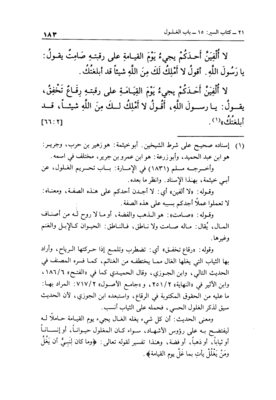 لَا أُلْفَيَنَّ أَحَدَكُمْ يَجِيءُ يَوْمَ الْقِيَامَةِ عَلَى رَقَبَتِهِ رِقَاعٌ تَخْفُقُ يَقُولُ: يَا رَسُولَ اللَّهِ، أَقُولُ: لَا أَمْلِكُ لَكَ مِنَ اللَّهِ شَيْئًا قَدْ أَبْلَغْتُكَ (¬1) . [2: 66]