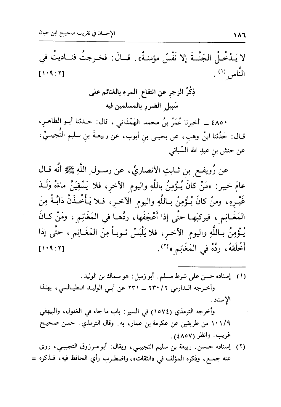 4850 - أَخْبَرَنَا عُمَرُ بْنُ مُحَمَّدٍ الْهَمْدَانِيُّ، قَالَ: حَدَّثَنَا أَبُو الطَّاهِرِ قَالَ: حَدَّثَنَا ابْنُ وَهْبٍ، عَنْ يَحْيَى بْنِ أَيُّوبَ، عَنْ رَبِيعَةَ بْنِ سُلَيْمٍ التُّجِيبِيِّ، عَنْ حَنَشِ بْنِ عَبْدِ اللَّهِ السَّبَائِيِّ، عَنْ رُوَيْفِعِ بْنِ ثَابِتٍ الْأَنْصَارِيِّ، عَنْ رَسُولِ اللَّهِ صَلَّى اللَّهُ عَلَيْهِ وَسَلَّمَ، أَنَّهُ قَالَ عَامَ خَيْبَرَ: «مَنْ كَانَ يُؤْمِنُ بِاللَّهِ وَالْيَوْمِ الْآخِرِ فَلَا يَسْقِيَنَّ مَاءَهُ وَلَدَ غَيْرِهِ، وَمَنْ كَانَ يُؤْمِنُ بِاللَّهِ وَالْيَوْمِ الْآخِرِ فَلَا يَأْخُذَنَّ دَابَّةً مِنَ الْمَغَانِمِ فَيَرْكَبَهَا حَتَّى إِذَا أَعْجَفَهَا رَدَّهَا فِي الْمَغَانِمِ، وَمَنْ كَانَ يُؤْمِنُ بِاللَّهِ وَالْيَوْمِ الْآخِرِ فَلَا يَلْبَسْ ثَوْبًا مِنَ الْمَغَانِمِ حَتَّى إِذَا أَخْلَقَهُ رَدَّهُ فِي الْمَغَانِمِ» (¬2) . [2: 109]