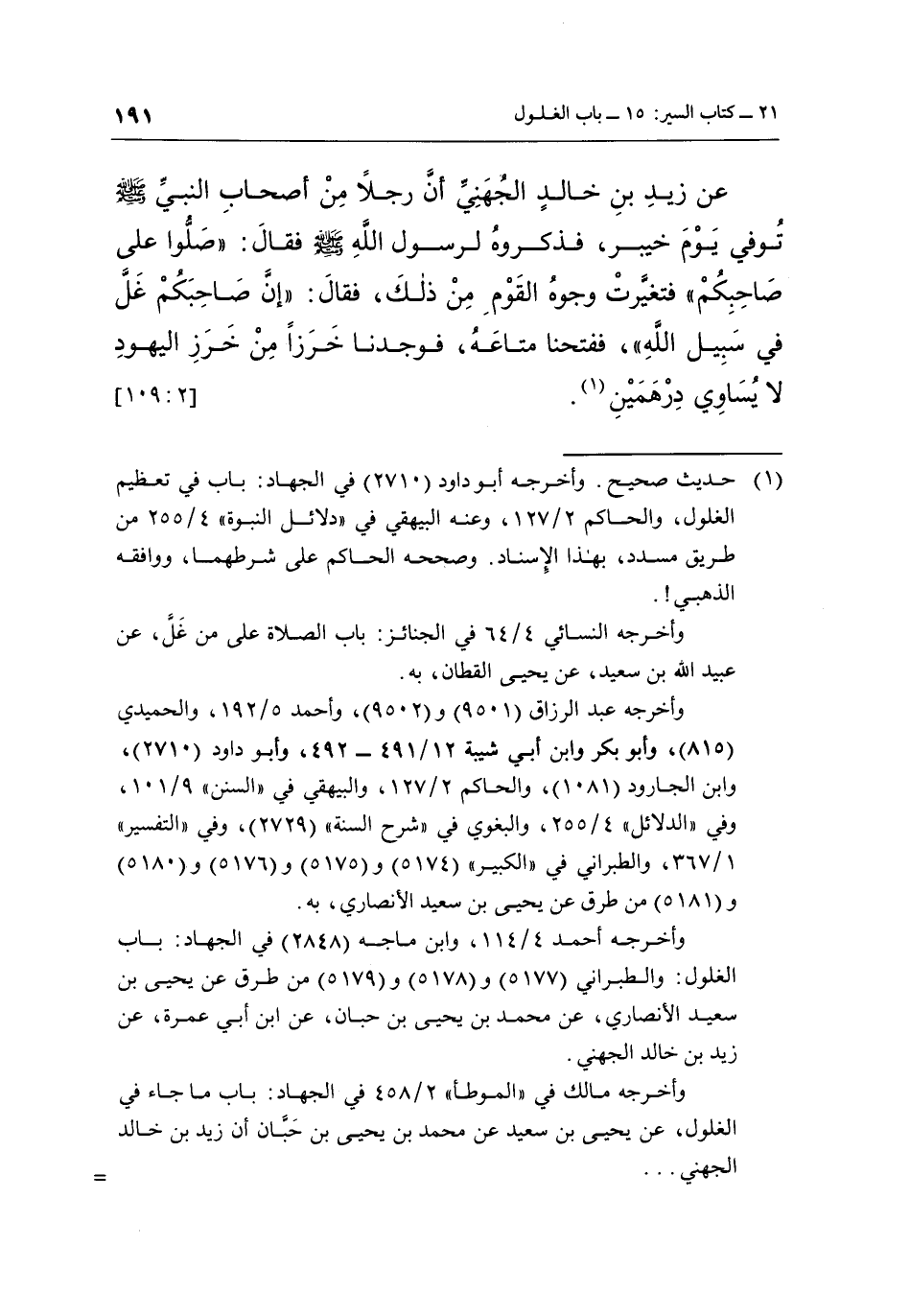 عَنْ زَيْدِ بْنِ خَالِدٍ الْجُهَنِيِّ أَنَّ رَجُلًا مِنْ أَصْحَابِ النَّبِيِّ صَلَّى اللَّهُ عَلَيْهِ وَسَلَّمَ تُوُفِّيَ يَوْمَ خَيْبَرَ، فَذَكَرُوهُ لِرَسُولِ اللَّهِ صَلَّى اللَّهُ عَلَيْهِ وَسَلَّمَ، فَقَالَ: «صَلُّوا عَلَى صَاحِبِكُمْ» ، فَتَغَيَّرَتْ وجُوهُ الْقَوْمِ مِنْ ذَلِكَ، فَقَالَ: «إِنَّ صَاحِبَكُمْ غَلَّ فِي سَبِيلِ اللَّهِ فَفَتَحْنَا مَتَاعَهُ، فَوَجَدْنَا خَرَزًا مِنْ خَرَزِ الْيَهُودِ لَا يُسَاوِي دِرْهَمَيْنِ (¬1) . [2: 109]