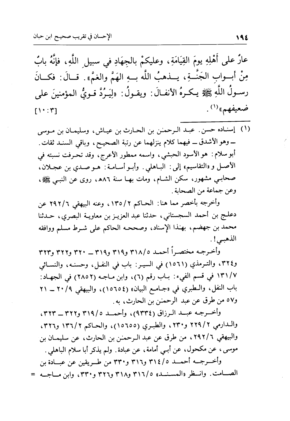 عَارٌ عَلَى أَهْلِهِ يَوْمَ الْقِيَامَةِ، وَعَلَيْكُمْ بِالْجِهَادِ فِي سَبِيلِ اللَّهِ فَإِنَّهُ بَابٌ مِنْ أَبْوَابِ الْجَنَّةِ يُذْهِبُ اللَّهُ بِهِ الْهَمَّ وَالْغَمَّ» قَالَ: فَكَانَ رَسُولُ اللَّهِ صَلَّى اللَّهُ عَلَيْهِ وَسَلَّمَ يَكْرَهُ الْأَنْفَالَ، وَيَقُولُ: «لِيَرُدَّ قَوِيُّ الْمُؤْمِنِينَ عَلَى ضَعِيفِهِمْ» (¬1) . [3: 10]