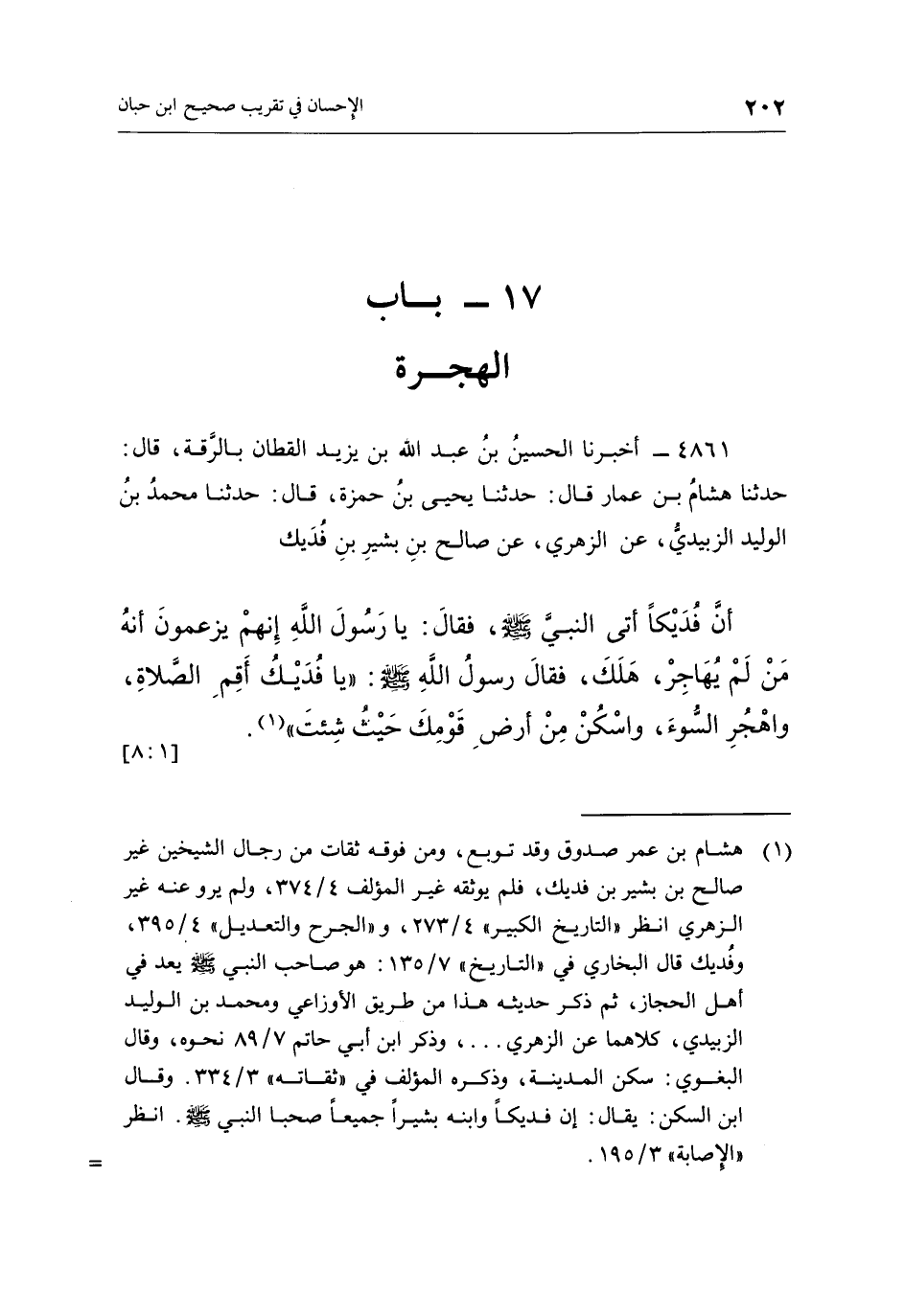 4861 - أَخْبَرَنَا الْحُسَيْنُ بْنُ عَبْدِ اللَّهِ بْنِ يَزِيدَ الْقَطَّانُ بِالرَّقَّةَ، قَالَ: حَدَّثَنَا هِشَامُ بْنُ عَمَّارٍ، قَالَ: حَدَّثَنَا يَحْيَى بْنُ حَمْزَةَ، قَالَ: حَدَّثَنَا مُحَمَّدُ بْنُ الْوَلِيدِ الزُّبَيْدِيُّ، عَنِ الزُّهْرِيِّ، عَنْ صَالِحِ بْنِ بَشِيرِ بْنِ فُدَيْكٍ، أَنَّ فُدَيْكًا أَتَى النَّبِيَّ صَلَّى اللَّهُ عَلَيْهِ وَسَلَّمَ، فَقَالَ: يَا رَسُولَ اللَّهِ، إِنَّهُمْ يَزْعُمُونَ أَنَّهُ مَنْ لَمْ يُهَاجِرْ هَلَكَ، فَقَالَ رَسُولُ اللَّهِ صَلَّى اللَّهُ عَلَيْهِ وَسَلَّمَ: «يَا فُدَيْكُ أَقِمِ الصَّلَاةَ وَاهْجُرِ السُّوءَ وَاسْكُنْ مِنْ أَرْضِ قَوْمَكَ حَيْثُ شِئْتَ» (¬1) . [1: 8]