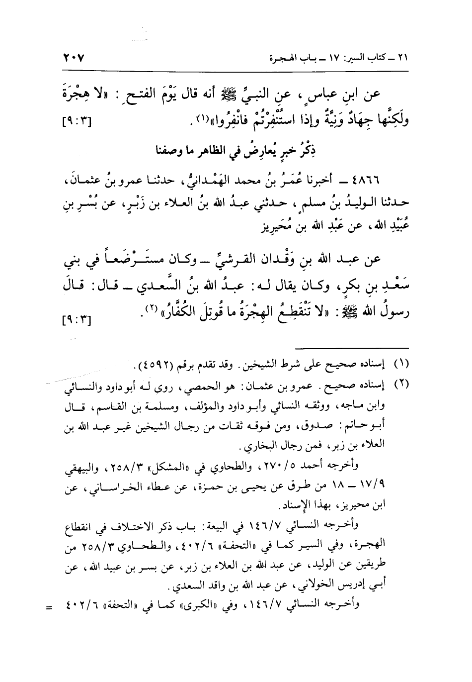 4866 - أَخْبَرَنَا عُمَرُ بْنُ مُحَمَّدٍ الْهَمْدَانِيُّ، حَدَّثَنَا عَمْرُو بْنُ عُثْمَانَ، حَدَّثَنَا الْوَلِيدُ بْنُ مُسْلِمٍ، حَدَّثَنِي عَبْدُ اللَّهِ بْنُ الْعَلَاءِ بْنِ زَبْرٍ، عَنْ بُسْرِ بْنِ عُبَيْدِ اللَّهِ، عَنْ عَبْدِ اللَّهِ بْنِ مُحَيْرِيزٍ، عَنْ عَبْدِ اللَّهِ بْنِ وَقْدَانِ الْقُرَشِيِّ - وَكَانَ مُسْتَرْضِعًا فِي بَنِي سَعْدِ بْنِ بَكْرٍ، وَكَانَ يُقَالُ لَهُ عَبْدُ اللَّهِ بْنُ السَّعْدِيِّ - قَالَ: قَالَ رَسُولُ اللَّهِ صَلَّى اللَّهُ عَلَيْهِ وَسَلَّمَ: «لَا تَنْقَطِعُ الْهِجْرَةُ مَا قُوتِلَ الْكُفَّارُ» (¬2) . [3: 9]