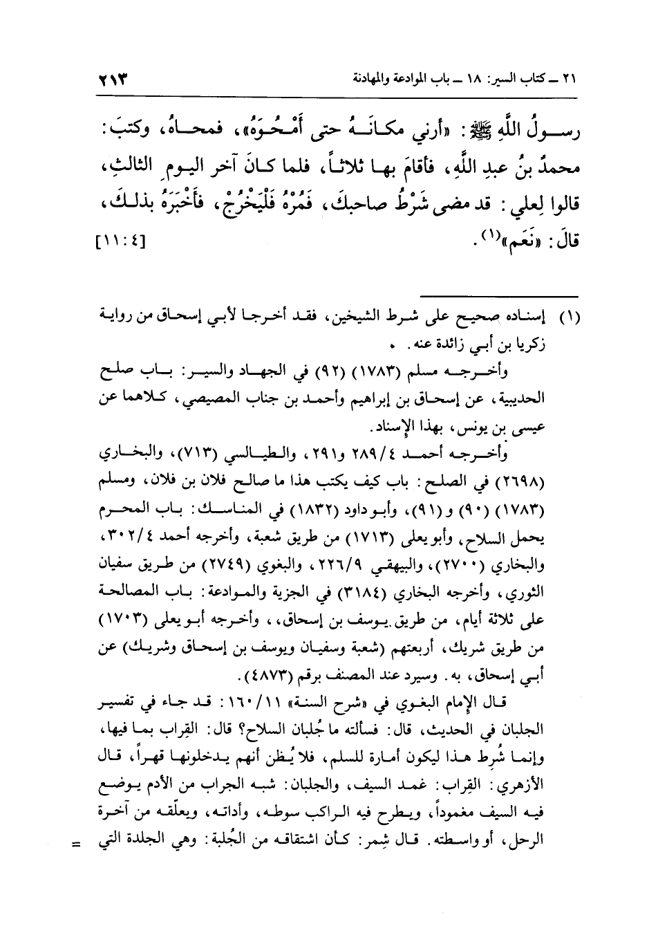 وأخرجه أحمد 4/289 و 291، والطيالسي (713) ، والبخاري (2698) في الصلح: باب كيف يكتب هذا ما صالح فلان بن فلان، ومسلم (1783) (90) و (91) ، وأبو داود (1832) في المناسك: باب المحرم يحمل السلاح، وأبو يعلي (1713) من طريق شعبة، وأخرجه أحمد 4/302، والبخاري (2700) ، والبيهقي 9/226، والبغوي (2749) من طريق سفيان الثوري، وأخرجه البخاري (3184) في الجزية والموادعة: باب المصالحة على ثلاثة أيام، من طريق يوسف بن إسحاق،، وأخرجه أبو يعلى (1703) من طريق شريك، أربعتهم (شعبة وسفيان ويوسف بن إسحاق وشريك) عن أبي إسحاق، به. وسيرد عند المصنف برقم (4873) .
