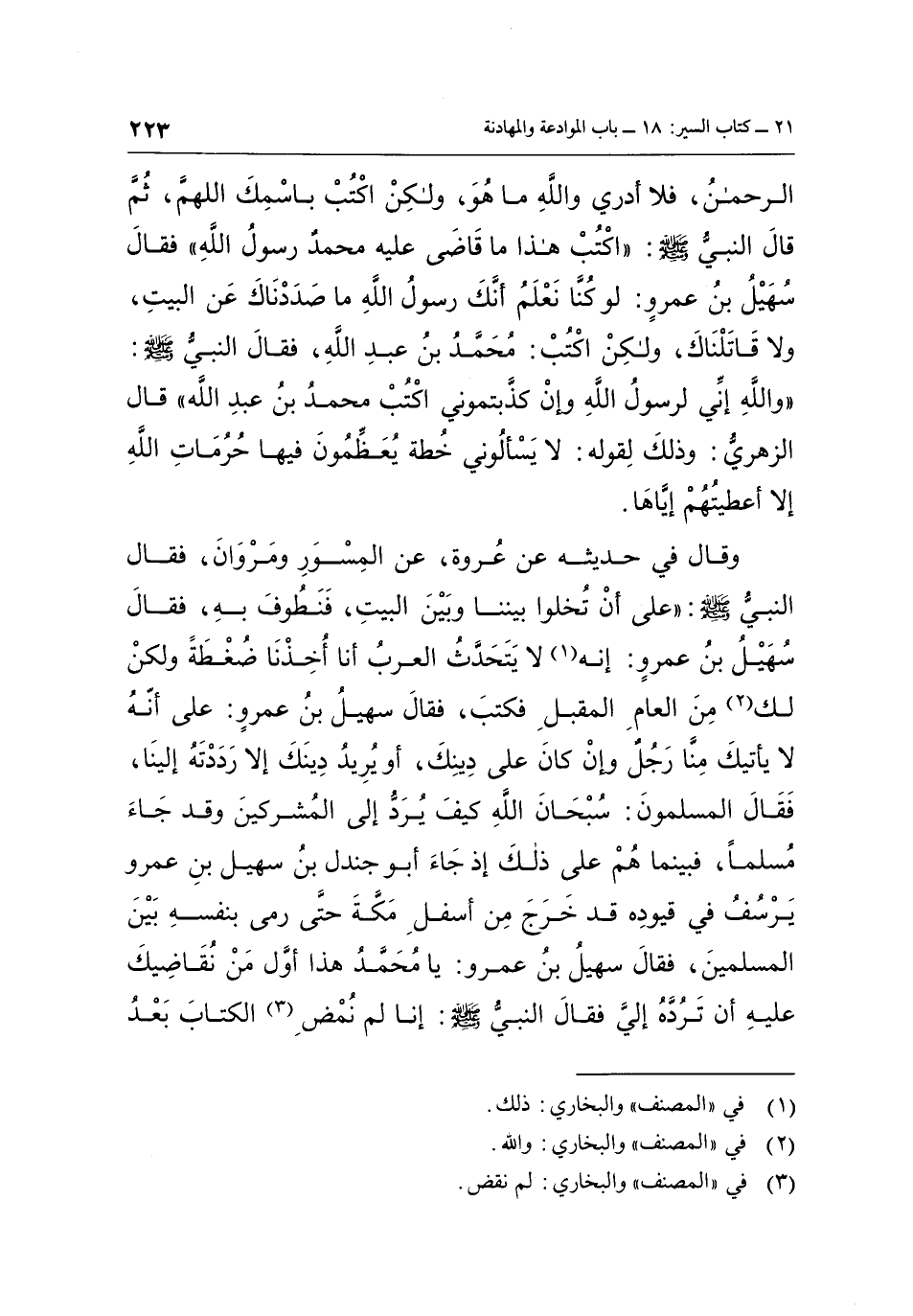 الرَّحْمَنُ، فَلَا أَدْرِي وَاللَّهِ مَا هُوَ، وَلَكِنِ اكْتُبْ بِاسْمِكَ اللَّهُمَّ، ثُمَّ قَالَ النَّبِيُّ صَلَّى اللَّهُ عَلَيْهِ وَسَلَّمَ: «اكْتُبْ هَذَا، مَا قَاضَى عَلَيْهِ مُحَمَّدٌ رَسُولُ اللَّهِ» ، فَقَالَ سُهَيْلُ بْنُ عَمْرٍو لَوْ كُنَّا نَعْلَمُ أَنَّكَ رَسُولُ اللَّهِ، مَا صَدَدْنَاكَ عَنِ الْبَيْتِ، وَلَا قَاتَلْنَاكَ، وَلَكِنِ اكْتُبْ مُحَمَّدُ بْنُ عَبْدِ اللَّهِ، فَقَالَ النَّبِيُّ صَلَّى اللَّهُ عَلَيْهِ وَسَلَّمَ: «وَاللَّهِ إِنِّي لَرَسُولُ اللَّهِ، وَإِنْ كَذَّبْتُمُونِي، اكْتُبْ مُحَمَّدُ بْنُ عَبْدِ اللَّهِ» ، قَالَ الزُّهْرِيُّ، وَذَلِكَ لِقَوْلِهِ لَا يَسْأَلُونِي خُطَّةً يُعَظِّمُونَ فِيهَا حُرُمَاتِ اللَّهِ، إِلَّا أَعْطَيْتُهُمْ إِيَّاهَا، وَقَالَ فِي حَدِيثِهِ عَنْ عُرْوَةَ، عَنِ الْمِسْوَرِ، وَمَرْوَانَ، فَقَالَ النَّبِيُّ صَلَّى اللَّهُ عَلَيْهِ وَسَلَّمَ: «عَلَى أَنْ تُخَلُّوا بَيْنَنَا، وَبَيْنَ الْبَيْتِ، فَنَطُوفُ بِهِ» ، فَقَالَ سُهَيْلُ بْنُ عَمْرٍو، إِنَّهُ (¬1) لَا يَتَحَدَّثُ الْعَرَبُ، أَنَّا أَخَذْنَا ضَغْطَةً، وَلَكِنْ لَكَ (¬2) مِنَ الْعَامِ الْمُقْبِلِ، فَكَتَبَ فَقَالَ سُهَيْلُ بْنُ عَمْرٍو: عَلَى أَنَّهُ لَا يَأْتِيكَ مِنَّا رَجُلٌ، وَإِنْ كَانَ عَلَى دِينِكَ، أَوْ يُرِيدُ دِينَكَ إِلَّا رَدَدْتَهُ إِلَيْنَا، فَقَالَ الْمُسْلِمُونَ: سُبْحَانَ اللَّهِ كَيْفَ يُرَدُّ إِلَى الْمُشْرِكِينَ، وَقَدْ جَاءَ مُسْلِمًا، فَبَيْنَمَا هُمْ عَلَى ذَلِكَ، إِذْ جَاءَ أَبُو جَنْدَلِ بْنُ سُهَيْلِ بْنِ عَمْرٍو يَرْسُفُ، فِي قُيُودِهِ، قَدْ خَرَجَ مِنْ أَسْفَلِ مَكَّةَ، حَتَّى رَمَى بِنَفْسِهِ بَيْنَ الْمُسْلِمِينَ، فَقَالَ سُهَيْلُ بْنُ عَمْرٍو يَا مُحَمَّدُ هَذَا أَوَّلُ مَنْ نُقَاضِيكَ عَلَيْهِ، أَنْ تَرُدَّهُ إِلَيَّ، فَقَالَ النَّبِيُّ صَلَّى اللَّهُ عَلَيْهِ وَسَلَّمَ: «إِنَّا لَمْ نُمْضِ (¬3) الْكِتَابَ بَعْدُ» ،